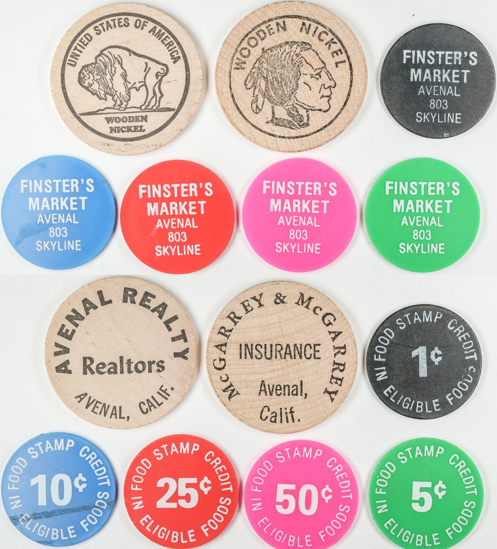 Lot of seven pieces from Avenal: wooden nickels from Avenal Realty & McGarrey Insurance; five plastic food stamp credit tokens from Finster's Market, GF 1, 5, 10, 25 & 50 cents, all 30 mm.