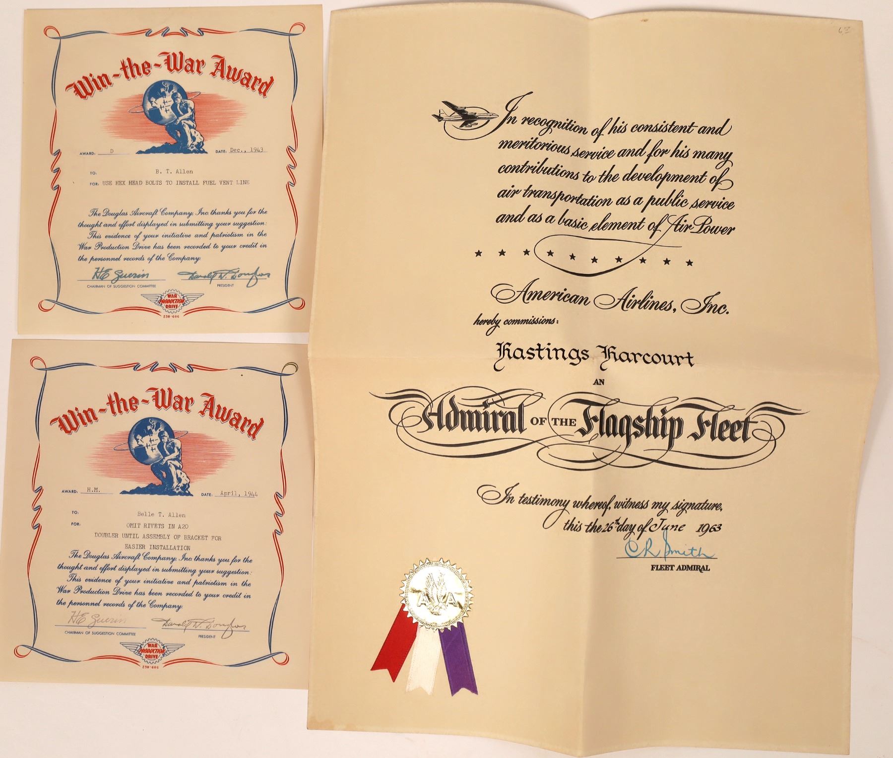 Lot of three: two "Win-The-War Awards" awarded by Douglas Aircraft Company (1943 & 1944) for suggestions resulting in improvements to aviation. Also a 1963 award by American Airlines "Admiral of the Flagship Fleet."
