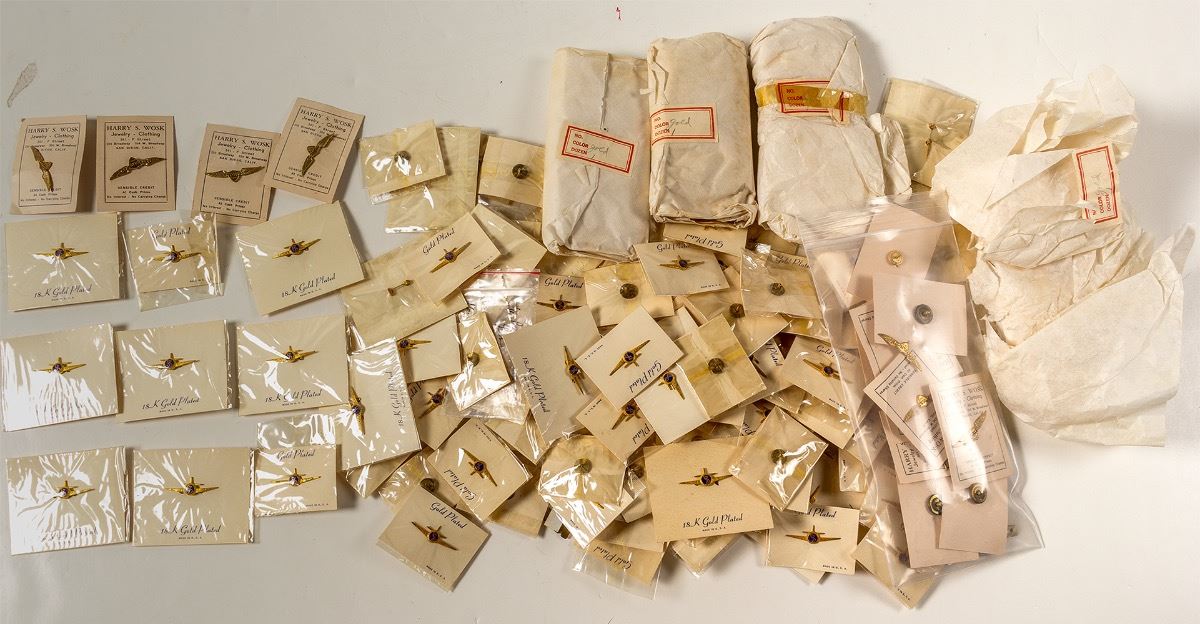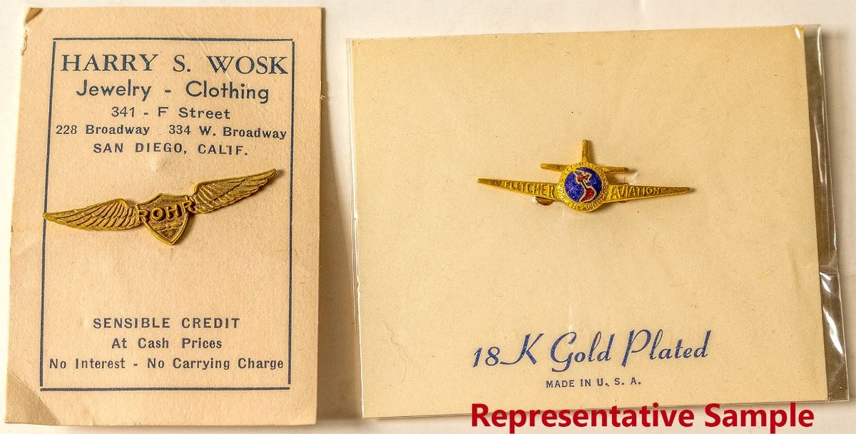 Dozens of 18K gold plated Fletcher Aviation buttons all unused in original packaging with a North and South America picture in the propeller. Also contains about 30 WWII aircraft manufacturer's employee wings from Ryan-Rolar Consolidated Aircraft. c.1940's-50's City: State: Date: Inventory# 38308