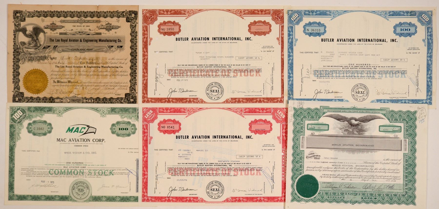 Lot of 6. Included: Lee Royal Aviation & Engineering Manufacturing Co. (1918); Monlin Aviation (1969); MAC Aviation Corp. (1973); and Butler Aviation International, Inc. (3 different, issued 1972-73). Please inspect. Ken Prag Collection