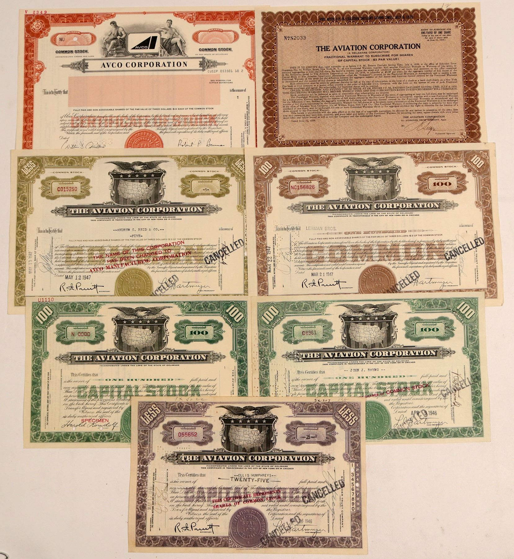 Lot of 7. Six different varieties. Five feature a vignette of an eagle perched on a shield with the map of the US on its face. Multiple different border colors. Issued 1946 (x2), 1947 (x2), and one Specimen. All cancelled. The other two stocks include a Fractional Warrant for 1/3 share (1939) and an unissued stock for the later company, Avco Corp. 1983. The Aviation Corporation was formed on March 2, 1929 to prevent a takeover of CAM-24 airmail service operator Embry-Riddle Company by Clement Melville Keys, who planned on buying Curtiss aircraft rather than Sherman Fairchild's. With capital from Fairchild, George Hann, the Lehman Brothers, and W. A. Harriman, the holding company began acquiring small airlines. By the end of 1929, it had acquired interests in over 90 aviation-related companies. In January 1930, the board broke off the airlines into Colonial and Universal Air Lines. Universal Air Lines name was changed to American Airways, and later merged with Colonial to form American Airlines. Became Avco in the 1950s, eventually bought by Textron. Ken Prag Collection