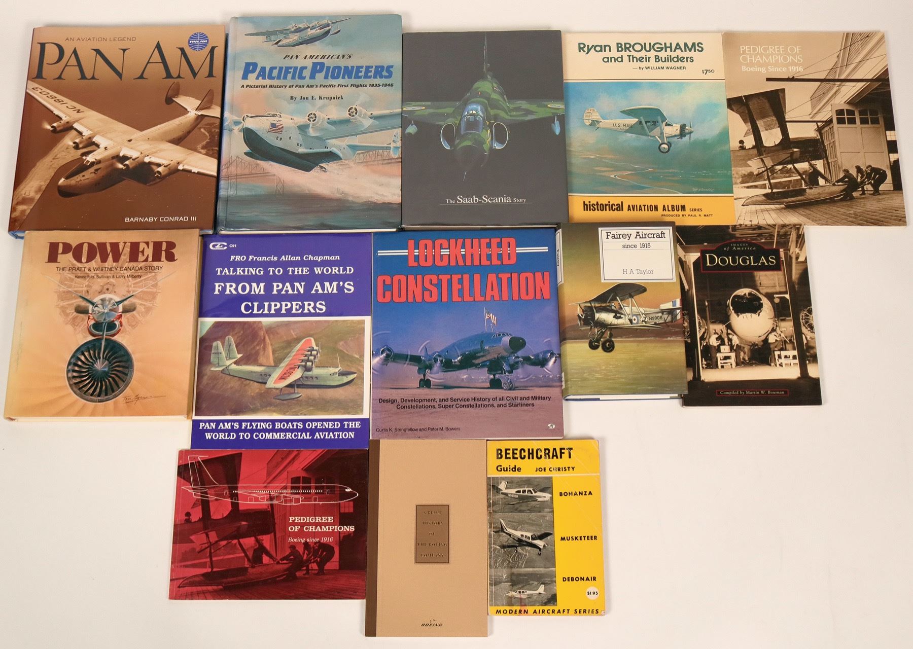Thirteen reference works on Aviation history: Pan Am, Conrad, 1999; Pan American's Pacific Pioneers, Krupnick, 1997; Saab-Scania Story, private press, no date (c1990s); Ryan Broughams and their Builders, Wagner, 1974; Pedigree of Champions, Boeing since 1916, 1977; Power, the Pratt & Whitney Canada Story, Sullivan et al, 1989; Talking to the World from Pan Ams Clippers, Chapman, 1999; Lockheed Constellation, Stringfellow et al, 1992; Beechcraft, Christy, undated, c 1950s, damaged; A Brief History of the Boeing Co., undated, c 1998; Pedigree of Champions, Boeing Since 1916, 1963; Douglas, Bowman, 1999; Fairey Aircraft, Taylor, 1974. All but one excellent, the hard bound books with full near-mint dust jackets.
