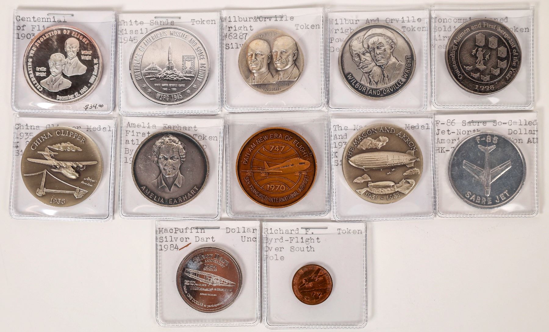 Lot of 12 medals celebrating aviation history, three are silver: China Clipper; Macon & Akron Airships & Wilbur & Orville Wright. Other medals: Amelia Earhart; Richard F. Byrd; F-86 So Called Dollar HK 743; White Sands Missile Base; 2003 Centennial of Flight; 1998 Airmen of the Year; 1984 Silver Dart 75th Anniversary; 1970 Pan Am 747 new era of flight; First Flight: Wilber & Orville.