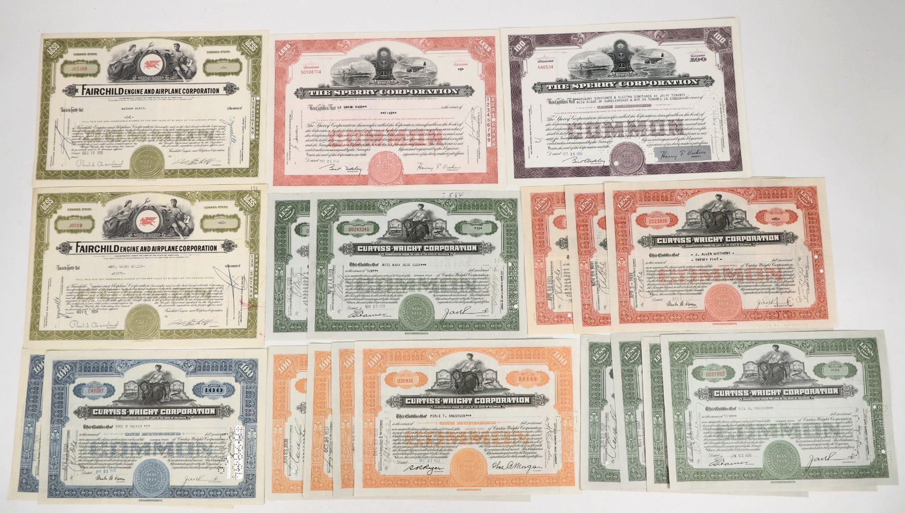 Group of aviation stock certificates: The Sperry Corporation (2); Fairchild Engine and Airplane Corporation (2); Curtiss-Wright Corporation (15).