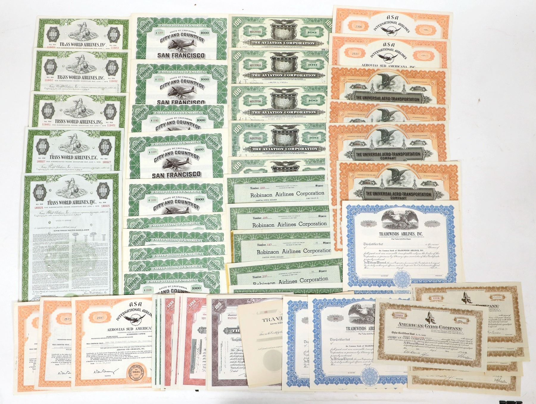 5 each. Issued-1968 ASA International Airlines. Sperry and Sperry Rand, green 1956, mauve 1955, violet 1954. 1946 Aviation Corp. Unissued-Travel Airways, Tradewinds Airlines, Universal Aero-Transportation, Robinson Airlines, American Gyro. Bonds-1961 TWA, 1949 San Francisco Airport.