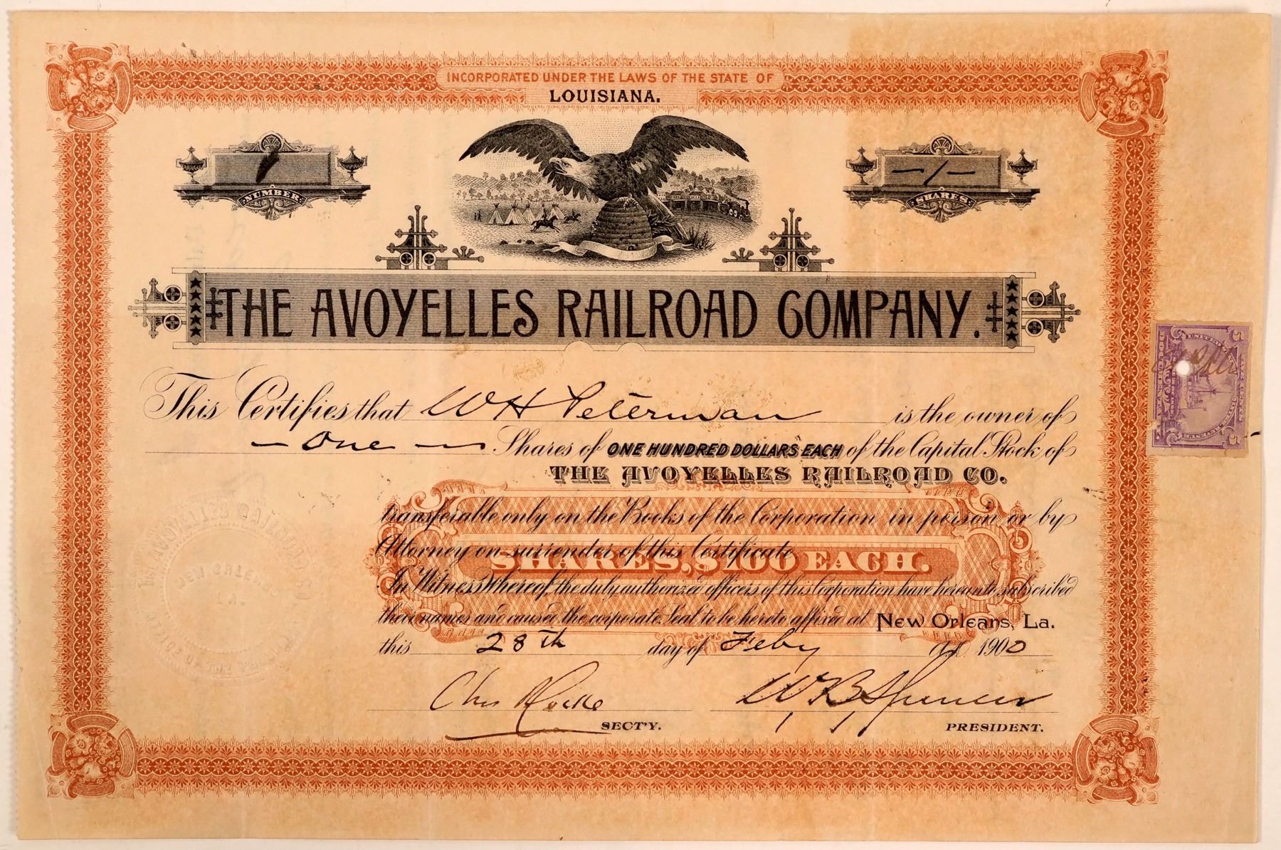 Nice Louisiana railroad stock certificate #1, issued at New Orleans in 1900. Eagle, beehive,tee-pees and a train vignette. Issued to W.H. Peterman for one share. Revenue stamp in right border. Uncancelled. Cox shows no issued certificates from this railroad, so this is rare.