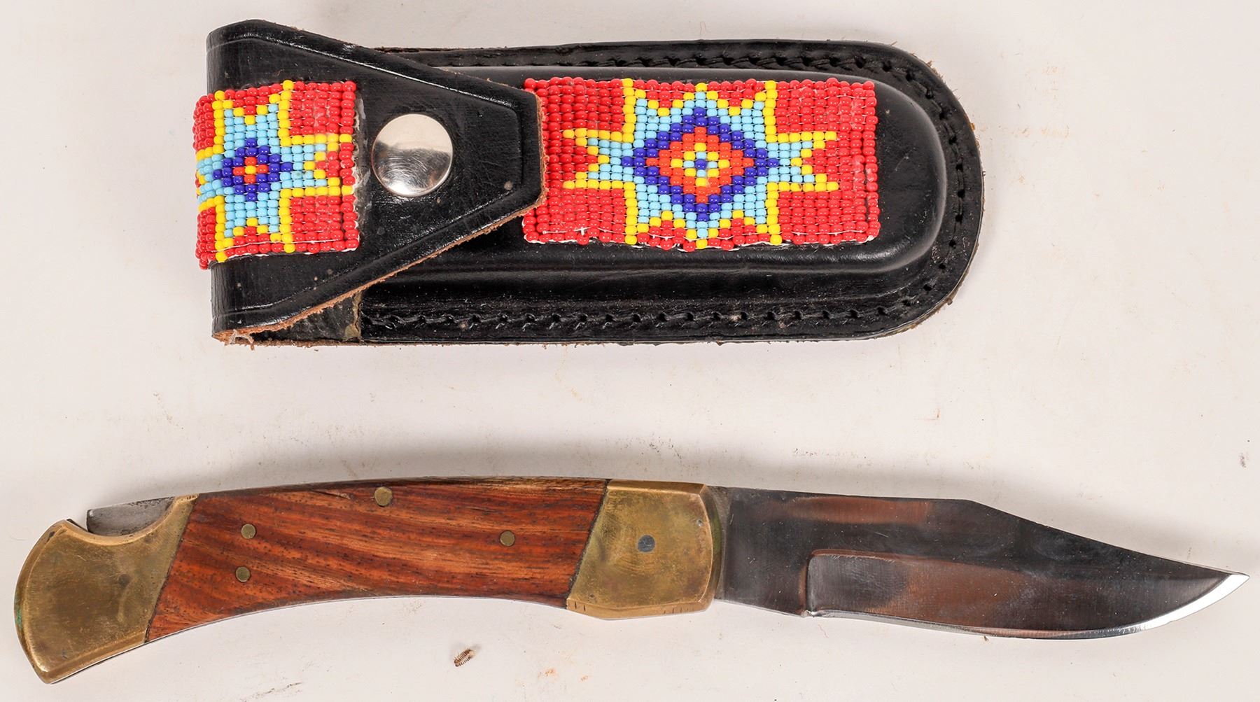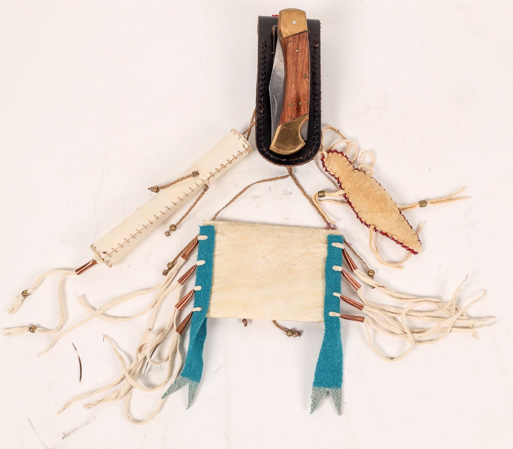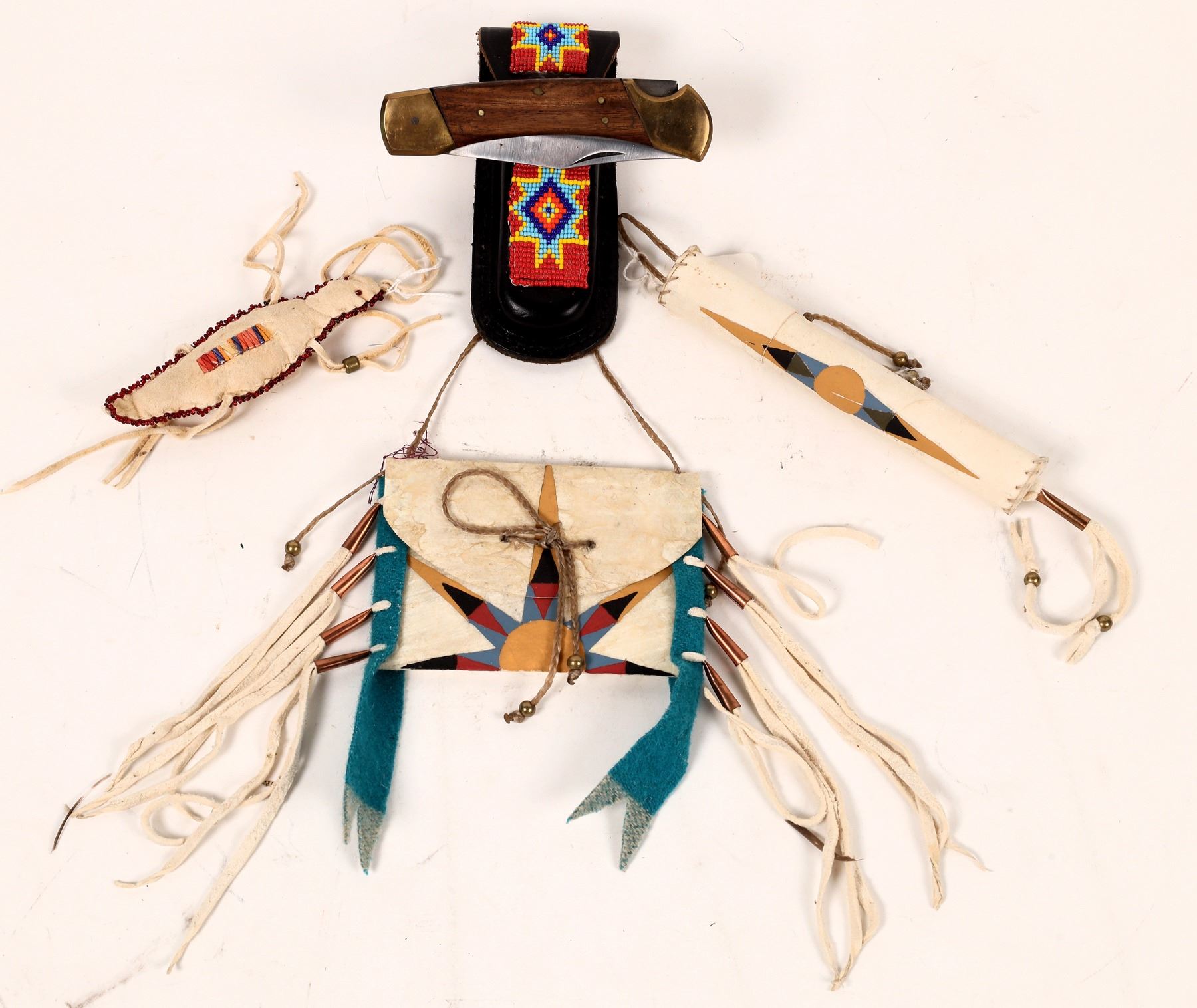Awl case and purse for needles with copper and brass accents and matching pattern 6.5" round awl case. Beaded black leather knife case with modern imported folding knife, 5.75x2.25". Lizard amulet with porcupine quill and red beads, some quill may be missing. 5x1.5".