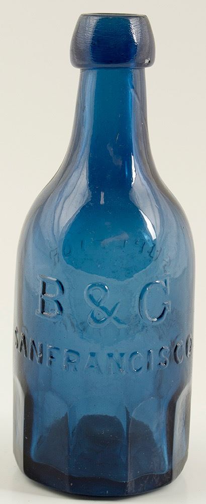 B & G / San Francisco // ( 1852-1856 ): Beautiful cobalt blue. Exceptionally light wear, on the reverse. Tiny pot stone in side of blob, no radiations. Nice rough , metallic pontil. Date: Location: SAN FRANCISCO, California HWAC# 29865