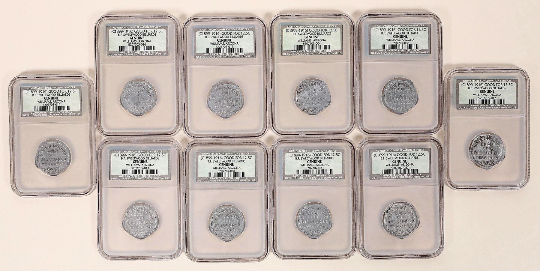 Lot of ten token certified Genuine by Numismatic Conservation Services: B.F. SWEETWOOD / POOL / AND / BILLIARDS / WILLIAMS, / ARIZ. / L.A. RUB. STAMP CO. // GOOD FOR / 12Ω / IN TRADE; Al, pentagonal, 26 mm.