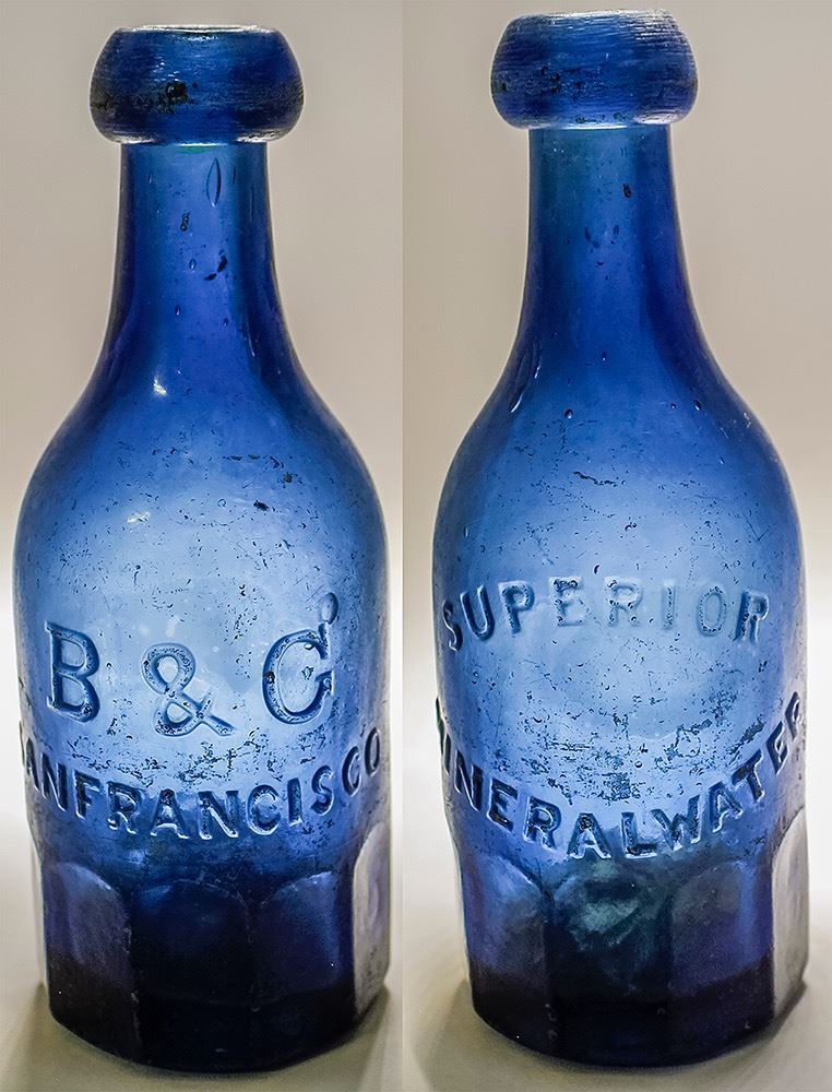 Cobalt.B. & G./ San Francisco/ Superior/ Mineral Water. Consistent wear around bottle. No visible cracks or chips. Shamberger collection. HWAC# 50102 Date: Location: San Francisco, California