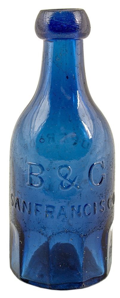Classic California Gold Rush cobalt blue soda bottle. It dates from 1852-1853, managed by Bache & Grotjan. Pontil. "Mug" or fluted base. In a study group of 14 of these bottles purchased over 40 years, there were no real color variations or embossing varieties. This is an excellent, apparent problem free bottle. Please inspect. City: San Francisco State: California Inventory Number: 39537
