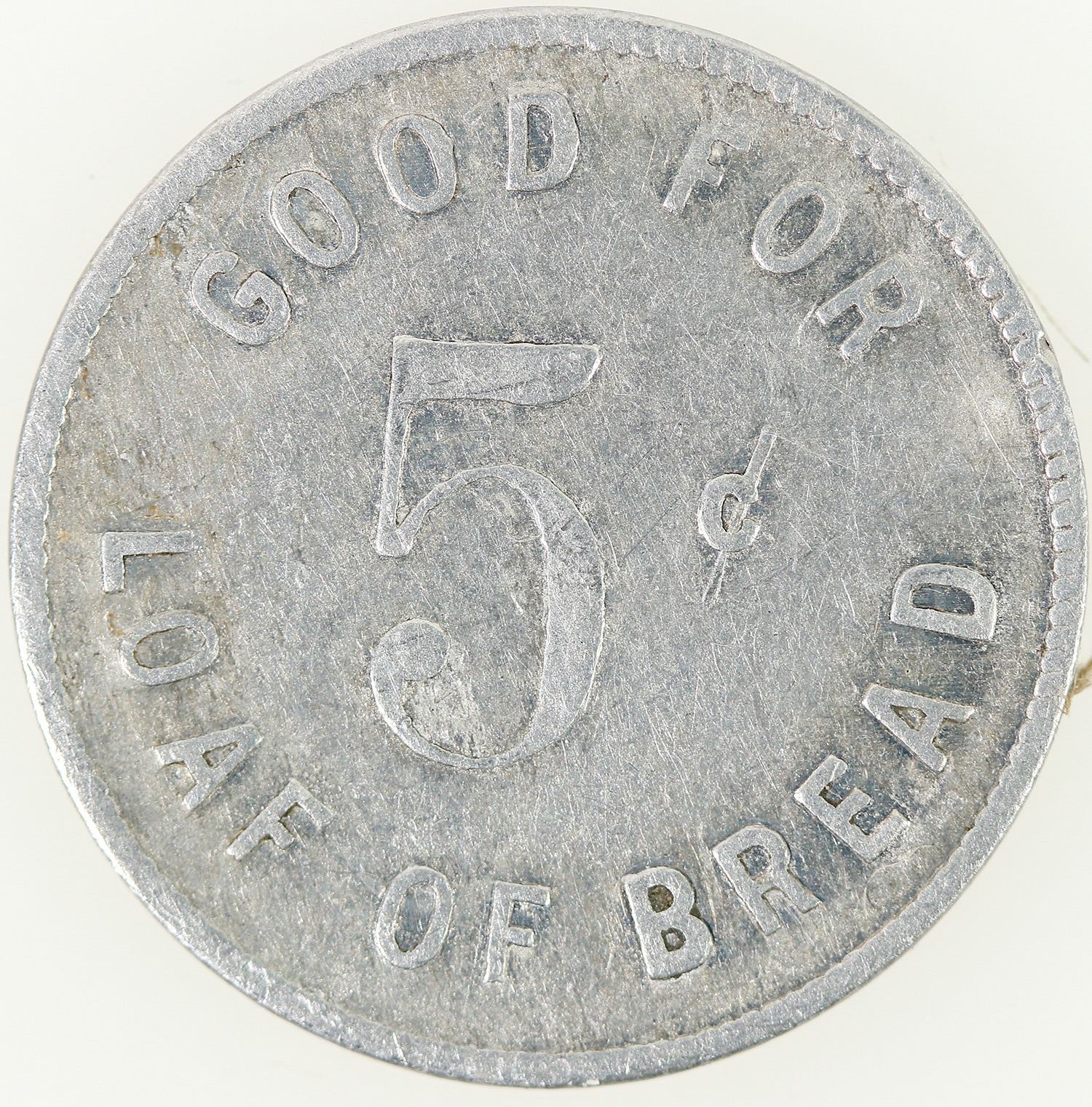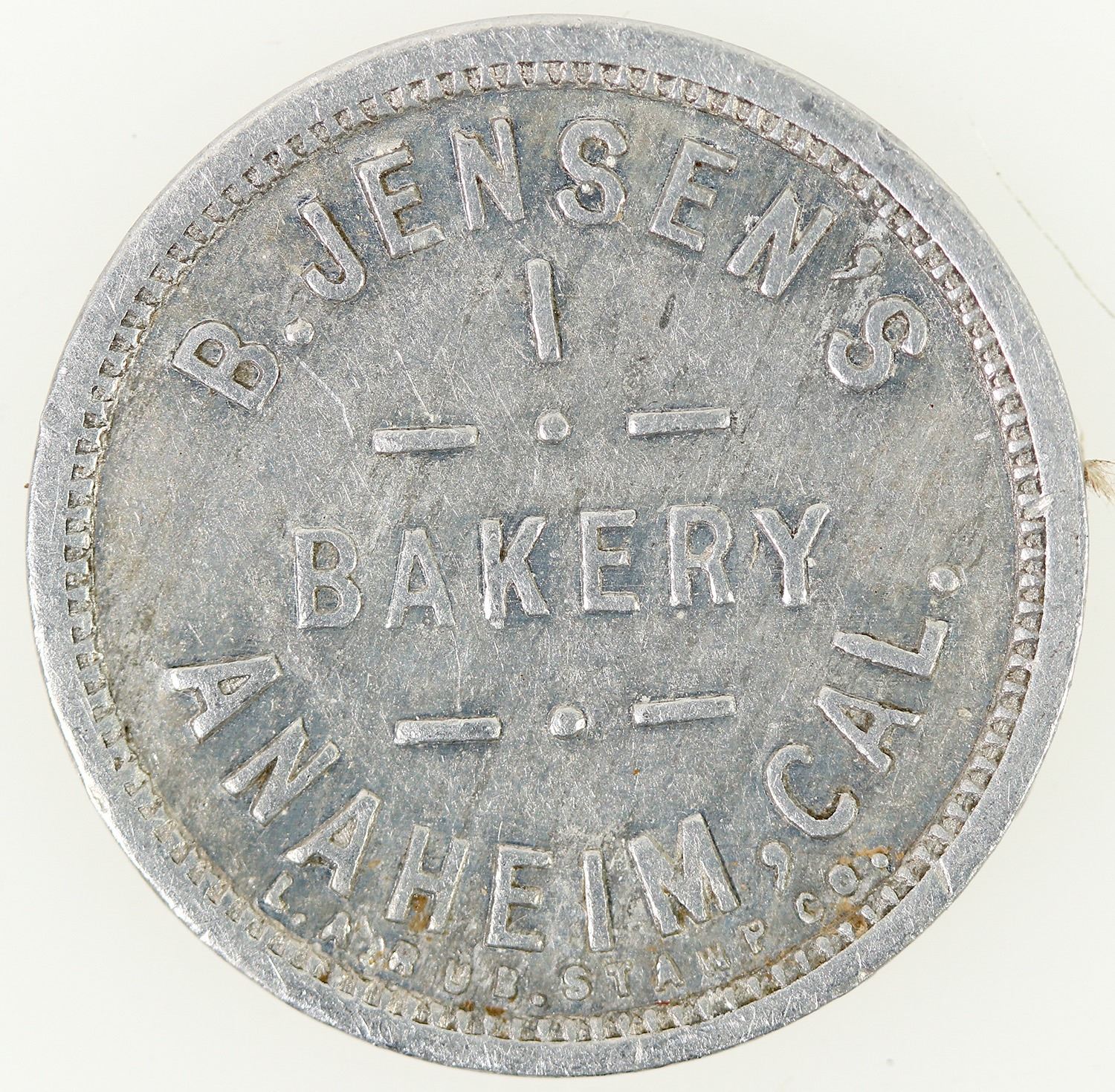 B. JENSEN'S / BAKERY / ANAHEIM, CAL. / L.A. RUB. STAMP CO. // GOOD FOR / 5¢ / LOAF OF BREAD; Al., rd., 24 mm.