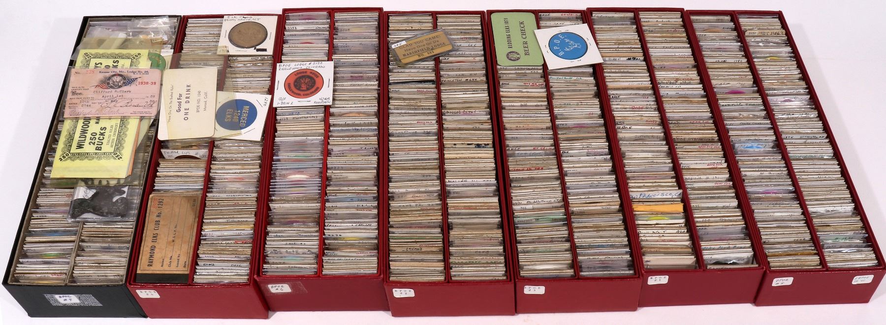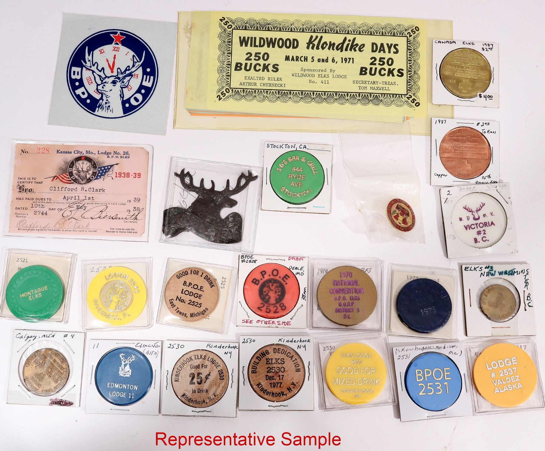 In 1975 Duane Feisel compiled a list of lodges published in Trade Token Topics. In October 1991, Robert Cardiff and Michael J. O'Brien published a list of Elks Lodges in the TAMS Journal (a copy is included). Also a 1939 membership card from Kansas City Lodge No. 26; some scrip from various lodges. A unique opportunity to acquire a lifetime collection of this important fraternal organization! Please come inspect this unique opportunity in person!