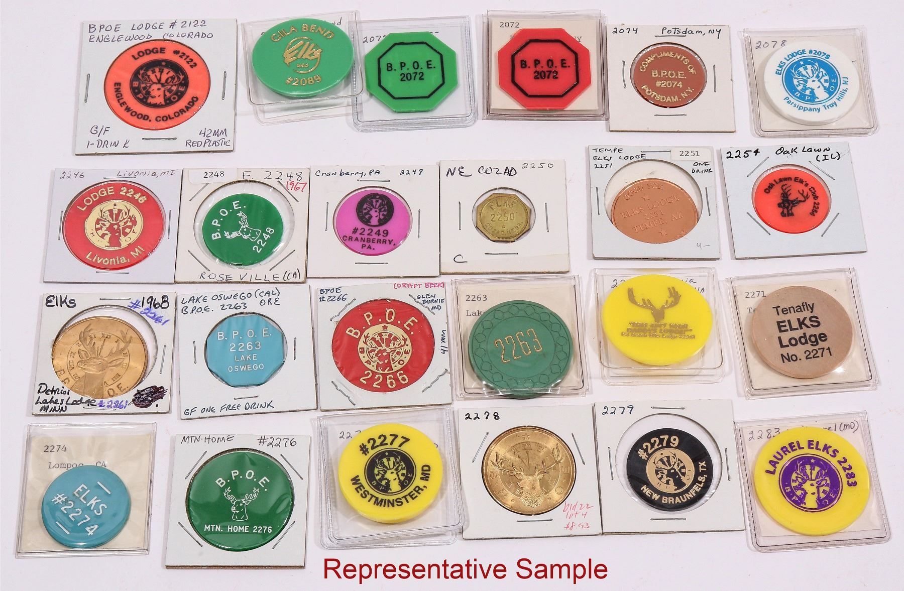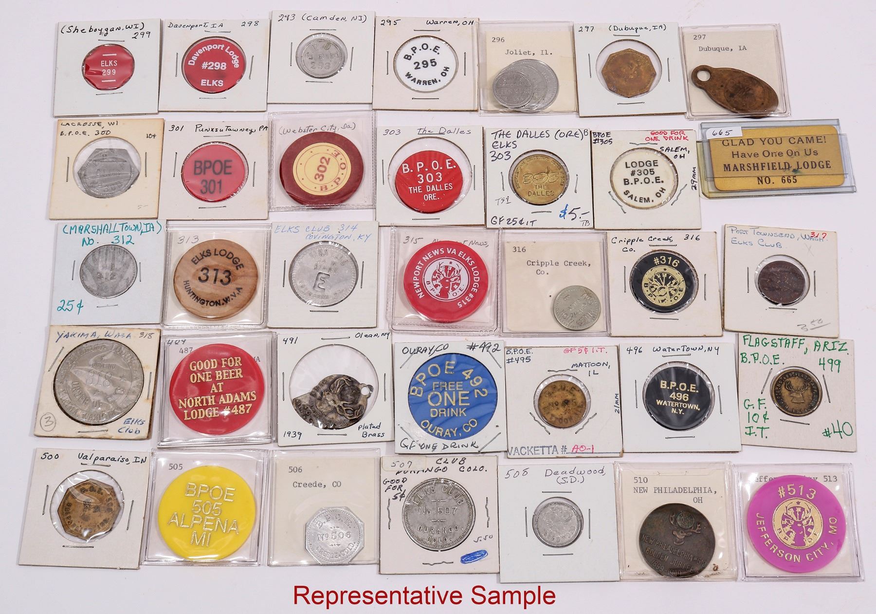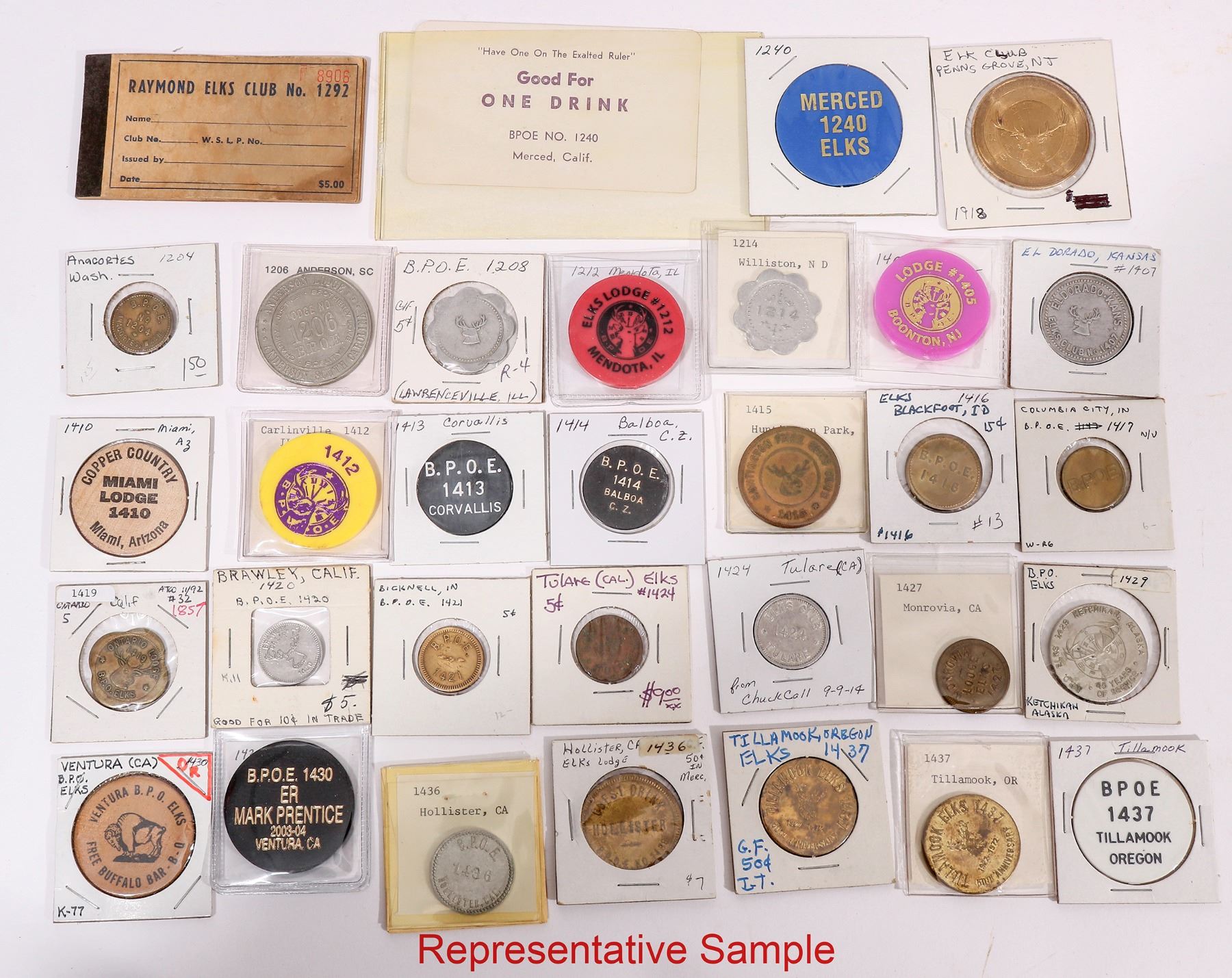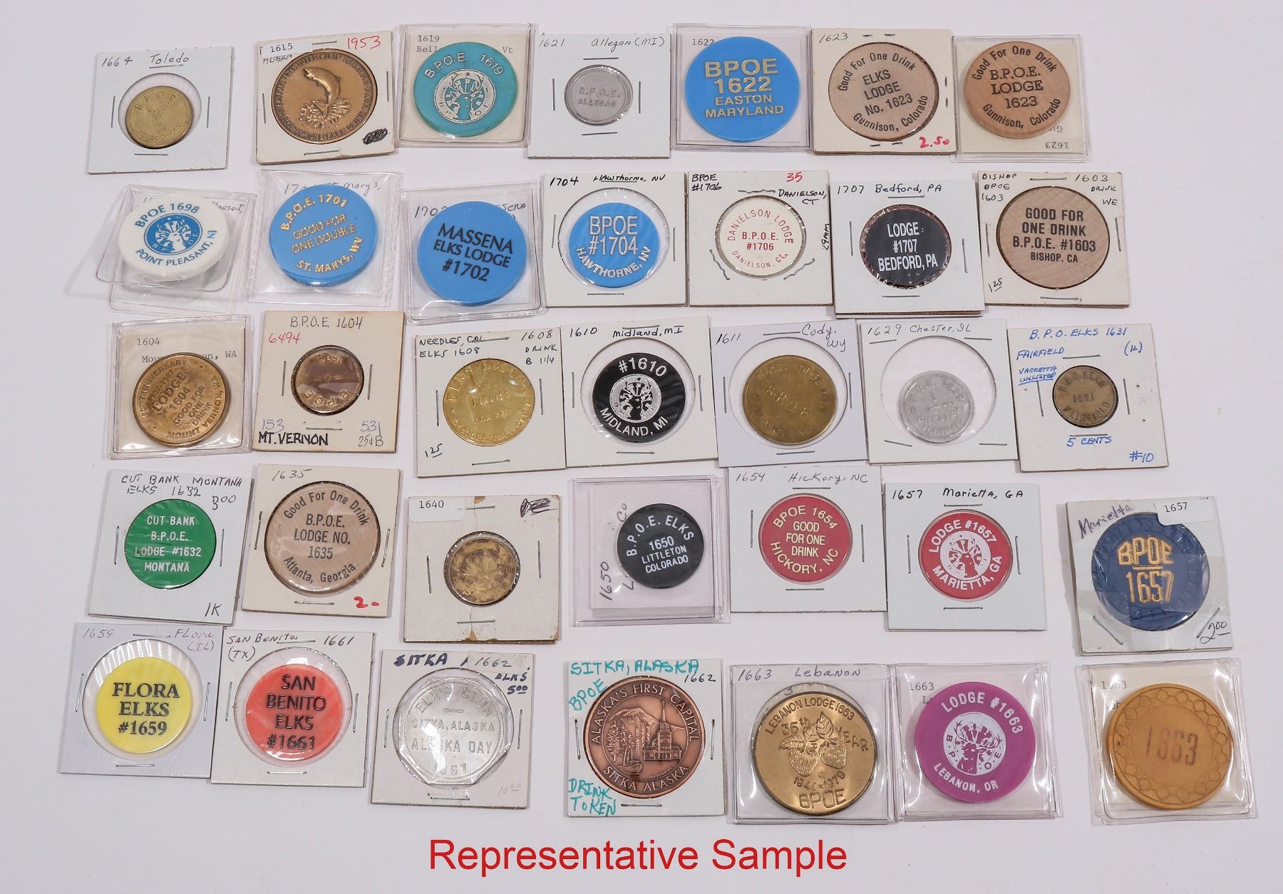 Quite possibly the largest collection of the Benevolent and Protective Order of Elks lodge tokens ever assembled. Seven double wide, 14 inch long boxes with over 1,800 tokens from around the country, Canada and international. For those unfamiliar with the fraternal organization, from the Elks Club homepage: " Since its founding on February 16, 1868, the Benevolent and Protective Order of Elks (BPOE) has been recognized by the noble creature that is the symbol of the Order. The elk is a peaceful animal, but will rise in defense of its own in the face of a threat. The majestic creature is fleet of foot and keen of perception. A most fitting representation, the stately elk is, for a distinctively American, intensely patriotic, family oriented organization subscribing to the cardinal principles of Elkdom, "Charity, Justice, Brotherly Love and Fidelity."