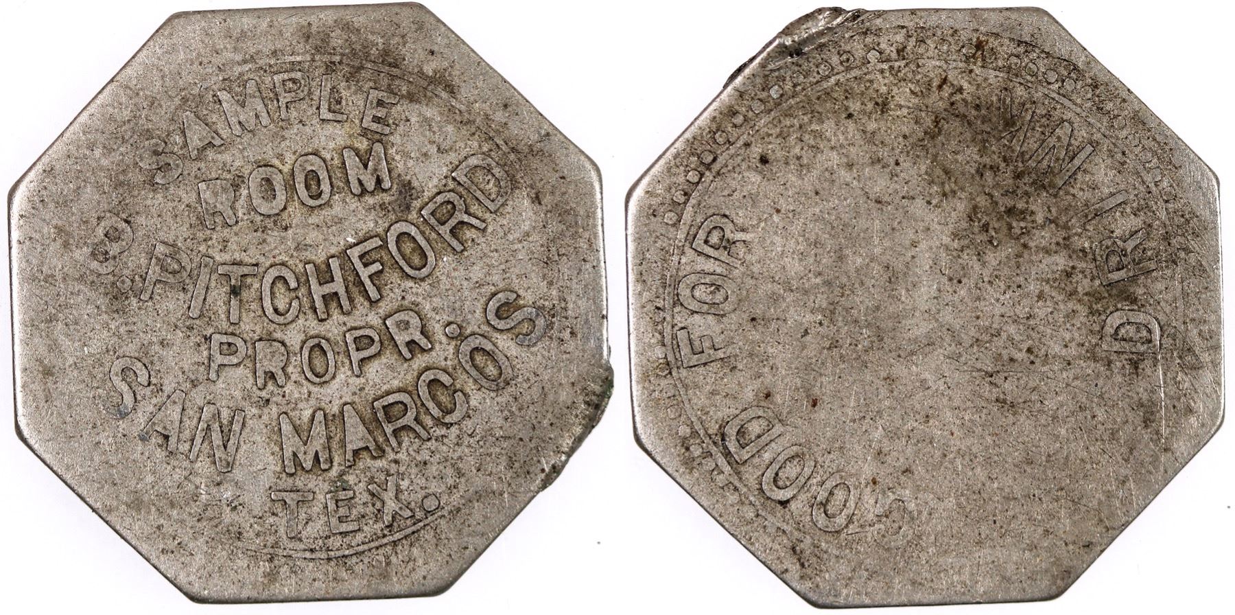 When they couldn't call them saloons they called them: SAMPLE / ROOM / B. PITCHFORD / PROPR. / SAN. MARCOS / TEX. // GOOD FOR / ONE / DRINK; Wm. octagonal, 25 mm.