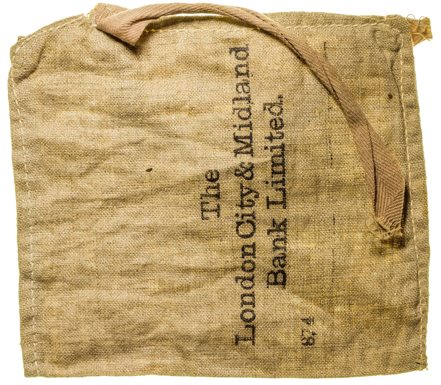 Sewn canvas bag, 4 1/2 x 5". Printed "The London City & Midland Bank Limited 874". Fine condition. State: England City: London Date: