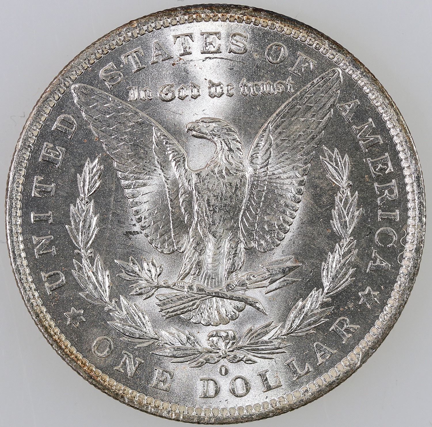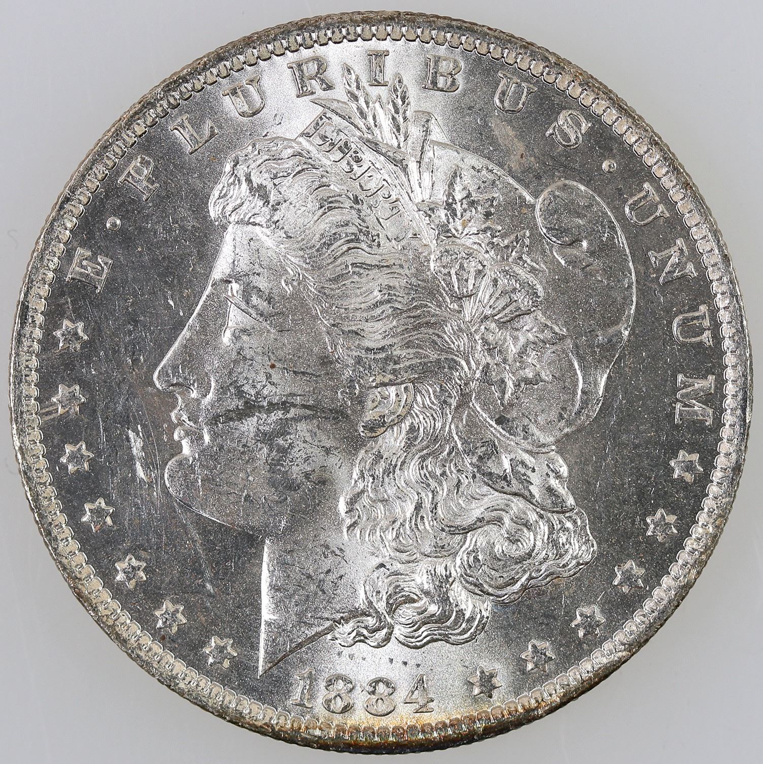 Not certified, but we call it BU: 1884-O Morgan Dollar. A touch of toning on the bottom rim. Mintage 9,730,000. [