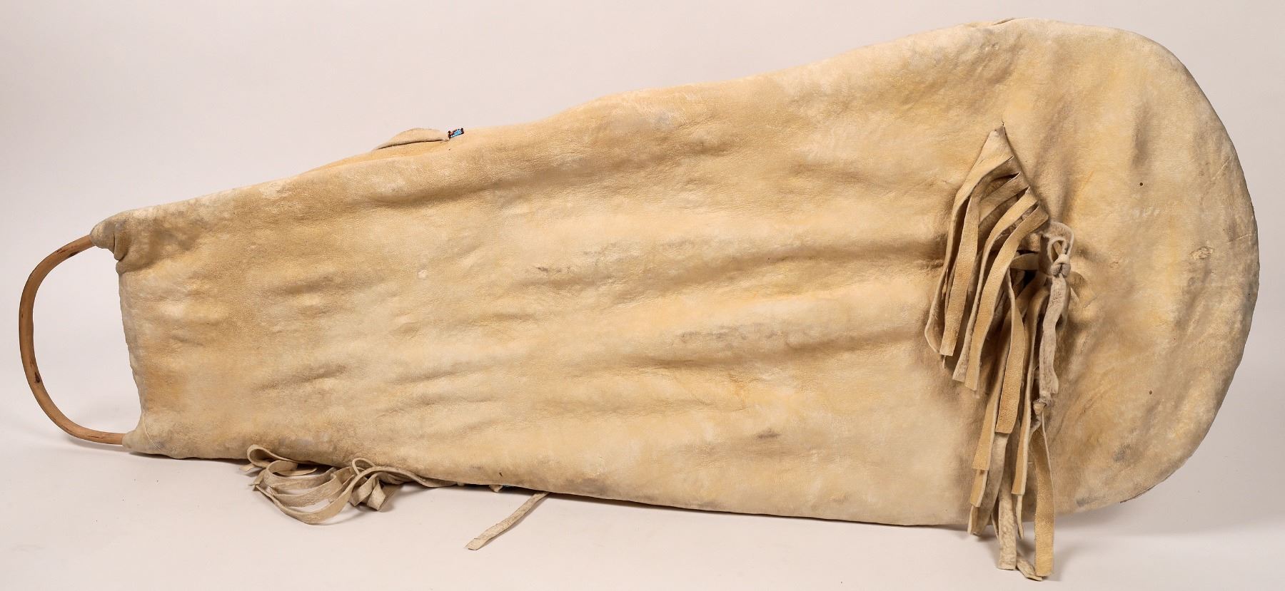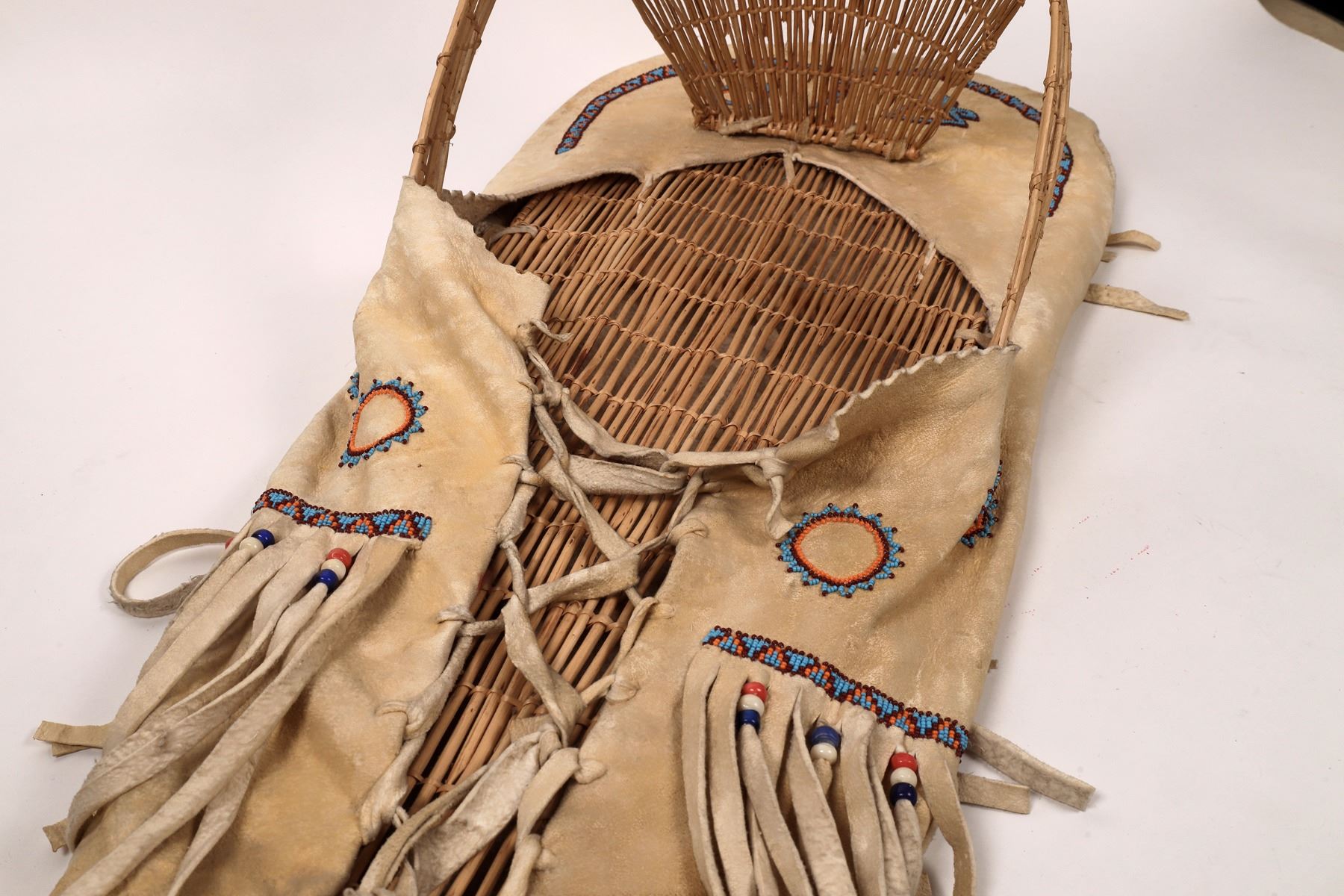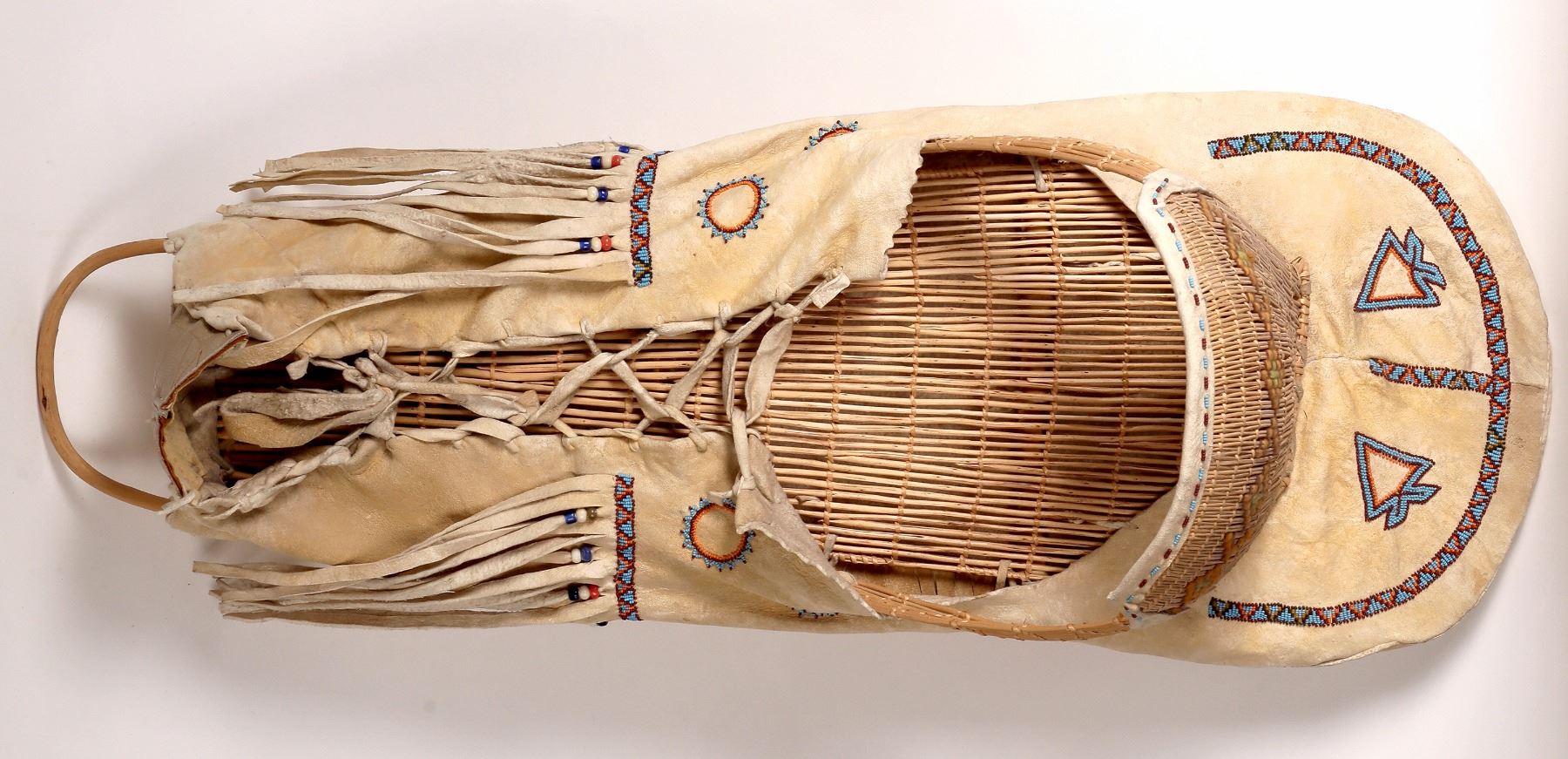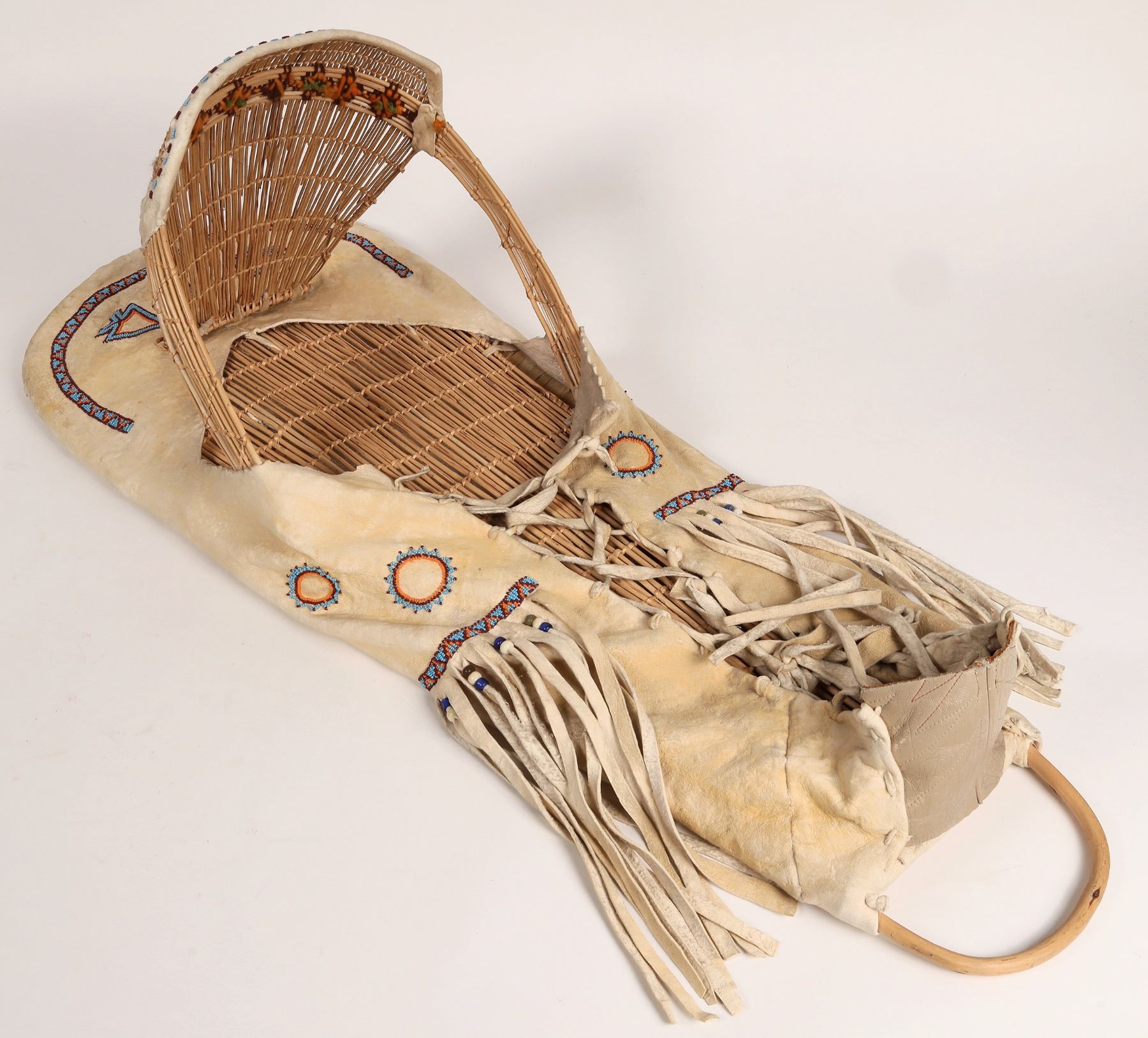 Woven willow baby basket from the Northern Paiute Tribe of Northern Nevada. Outer frame and bracing are made from a bent chokecherry branch with traditional twine-woven willow backboard and a sunshade held up with two slanted supports. The arc of the sunshade is decorated with a geometric pattern of brown, yellow, and green woolen yarn woven into the willow structure, indicating this basket was designed for a girl. The edge of the sunshade is trimmed in buckskin decorated with a line of alternating blue and brown, 11/0 glass beads. The basket frame and backboard is wrapped in an Indian-tanned buckskin covering beautifully decorated with more appliqued beadwork and long leather fringe. There are red, white, and blue pony beads on every third fringe. The buckskin is held closed with buckskin leather ties. This baby basket is in excellent condition with little wear and tear. See photos for design details. Thanks to Norm DeLorme for description details.