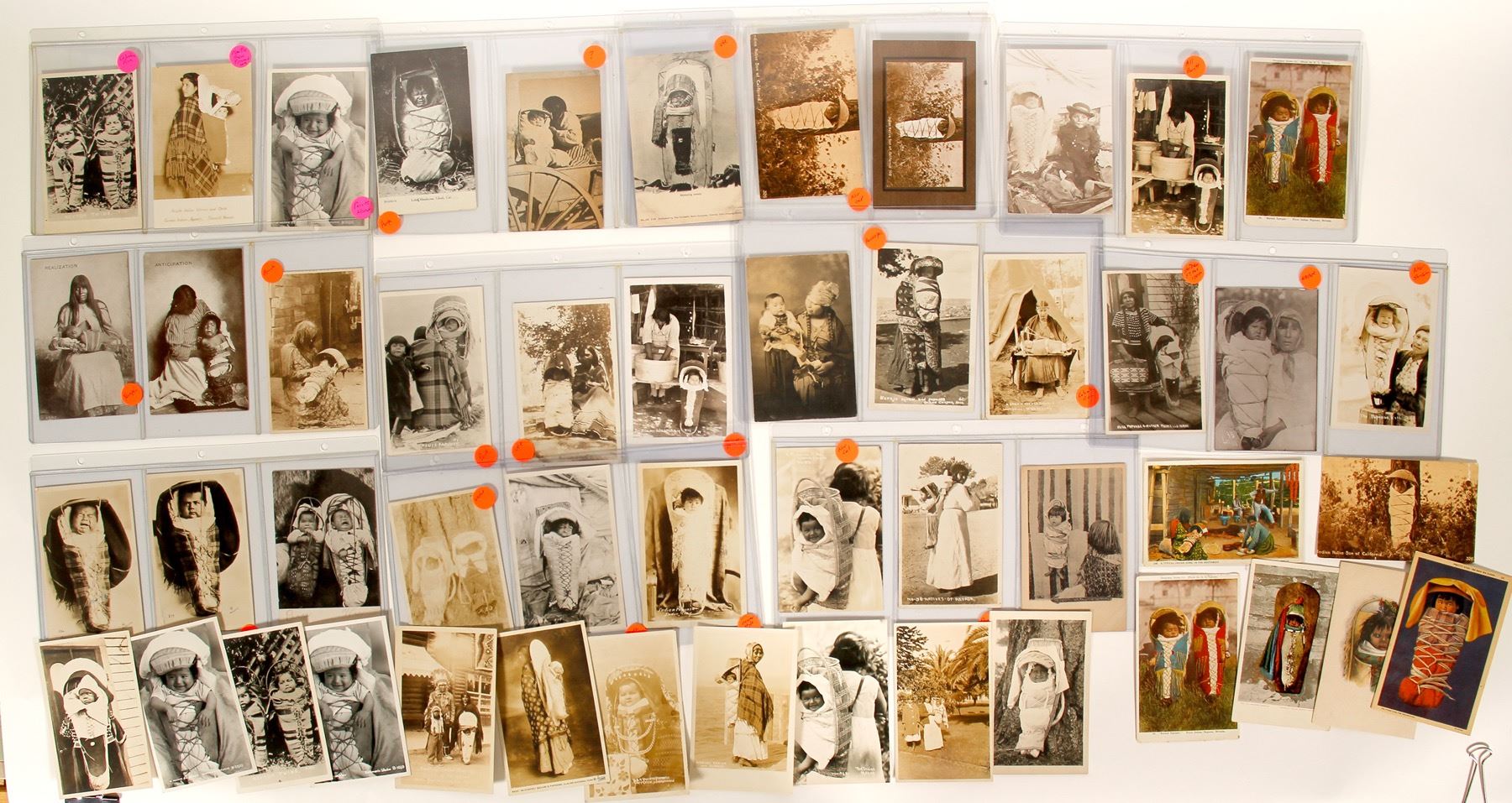 This is a collection of approx. 50 postcards of Native American babies in baskets. RPC: Five are without borders, 31 with white borders, 12 are chromo-litho, and 3 are modern. (ID'd by ND). This is a fantastic group showing the variety of Native American baby basket styles from throughout the West. Many are buckskin covered, some beaded; the show a variety of styles and head coverings. The cards have been labeled by ND for specific regional tribes.