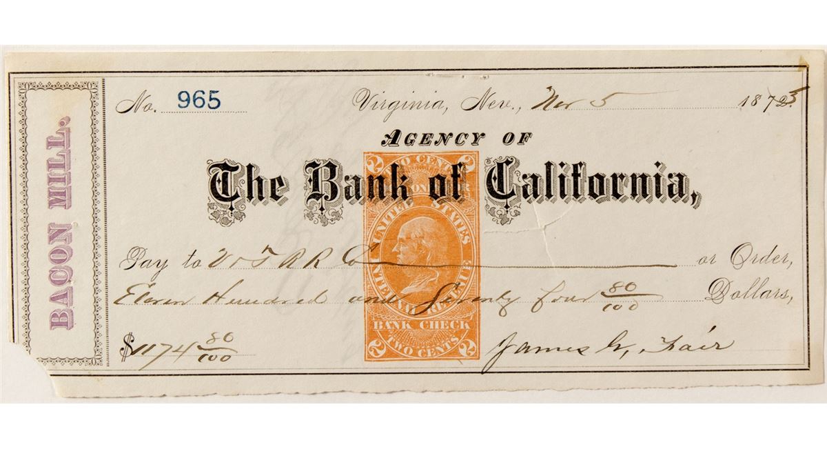 No. 965. Dateline Virginia, Nev., Nov. 5, 1873. Agency of the Bank of California. Pay the V&T Railroad $1174.80. Signed by James G. Fair. Rare RN-E. Reverse signed by King as secretary for the railroad. Lower left corner missing, plus tape on reverse corners. Spindle and staple holes.