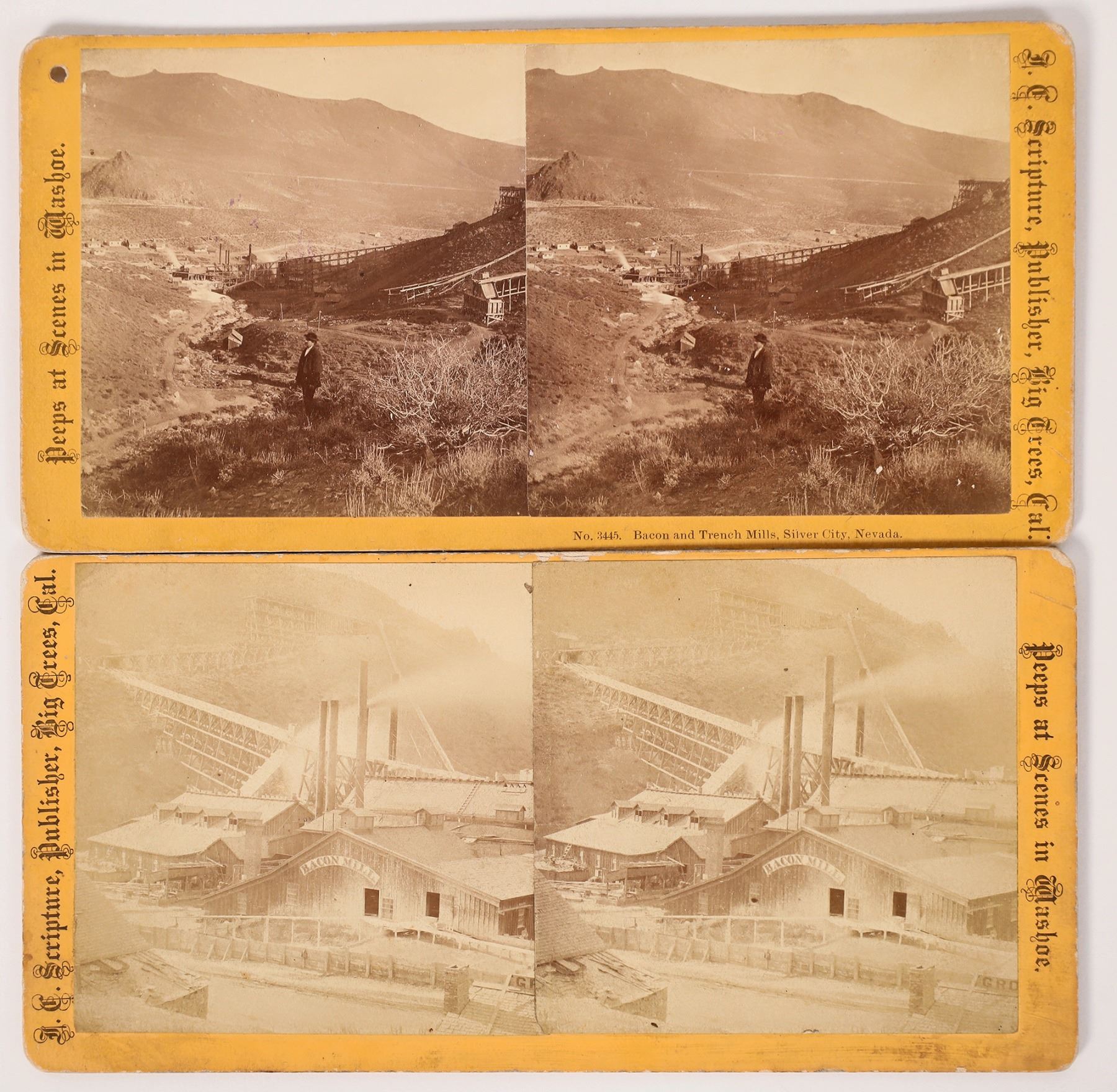 Lot of 2 different mills. These mills were in the vicinity of the original discovery site for the Comstock by the Grosh brothers. Both stereoviews are published by J.C. Scripture, Big Trees, Cal. and part of the series "Peeps at Scenes in Washoe." 1) Prominent close-up shot of the Bacon Mill with sign clearly in view. Contrast is light, but it's a nice shot regardless. Stamped on the back for Charles A. Smallwood, San Francisco. The Bacon Mill was located in Silver City at the intersection of Gold Canyon and American Ravine. It was built in 1862. In 1865, it was processing ore from the Bacon Mine in Gold Hill. By 1868, it was controlled by William Sharon and the Bank of California. In 1869, Fair and Mackay bought it to process Hale & Norcross mine ore. In 1871, it was reported to have 20 stamps and a 40 ton daily capacity. 2) No. 3445. Bacon and Trench Mills, Silver City, Nevada." View from on the hills behind the mills, looking down onto them with a man posing. Good contrast, sharp focus. Stamped on the back for VC bookseller F. Boegle, who operated in the 1870s and 80s. The Trench Mill was built in 1860 in lower Silver City near the mouth of American Ravine by Erastus Sparrow and Joseph Trench who also owned a mine in Gold Hill. Mackay and Fair purchased it in 1869. In the 1870s, it had 40 stamps and a 20-ton capacity (Ref: Ansari) Silver City Nevada