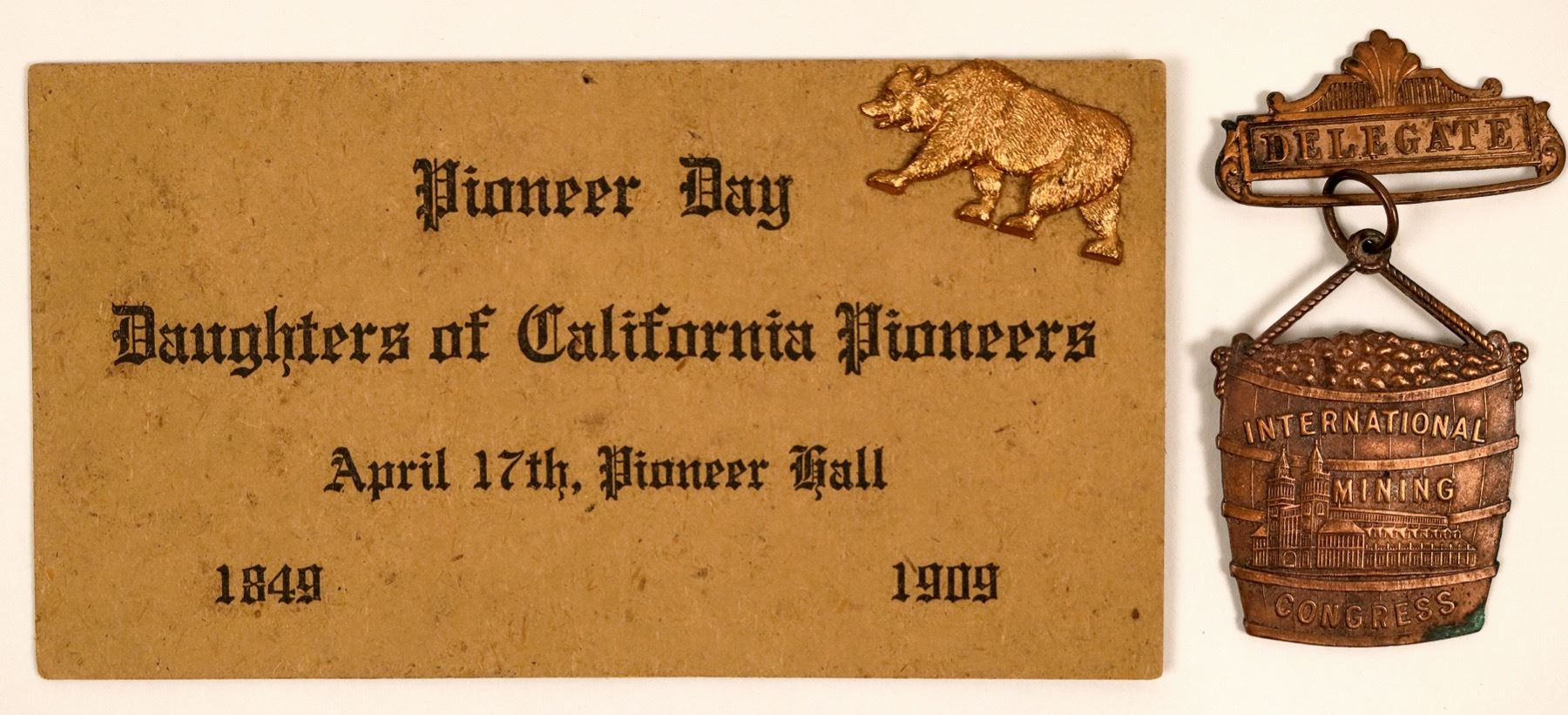 Lot of two badges, includes "delegate" badge, from the International Mining Congress, and a Pioneer Day, Daughters of California Pioneers grizzly bear pin on cardboard, printed with "1849-1909."