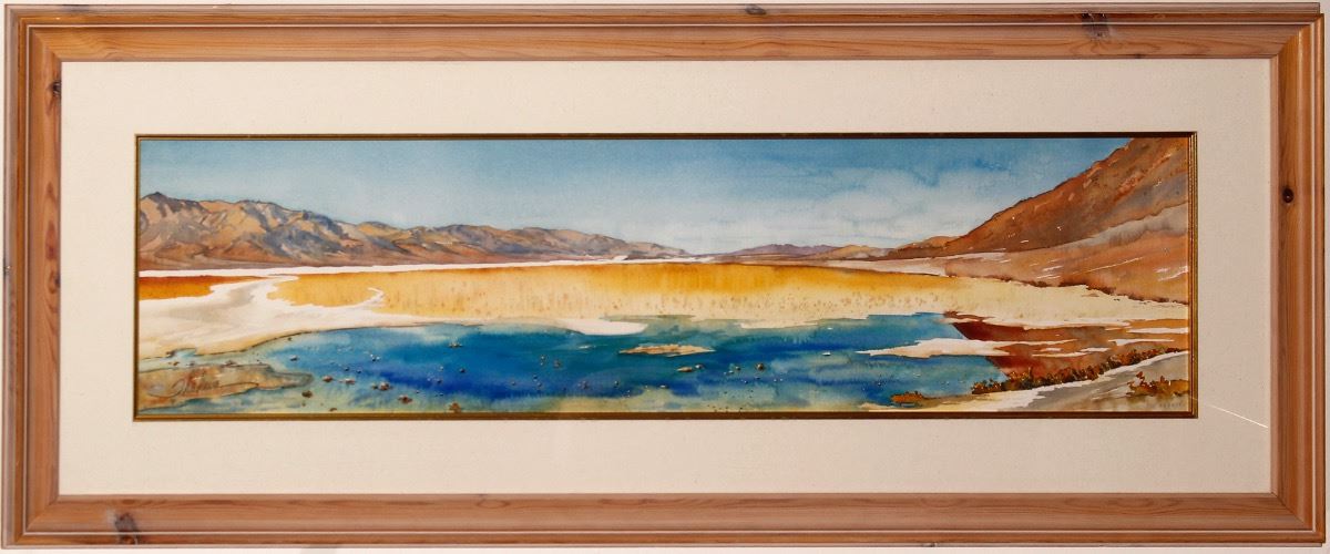 The lowest point in the United States (279 ft (85 m) below sea level), Badwater" in Death Valley National Park is the scene of this beautiful watercolor by California artist Thaleia Georgiades. Framed in a bleached light wood frame, matted in gold, the size is 21" h x 51" w. Thaleia has lived in California for over 30 years and her passion is to spend as much time as possible exploring and painting the landscape; especially the Sierra mountain regions. Her home and studio are uniquely located above 7000 feet, just below crest of the High Sierra Mountains. Whenever possible she packs on foot or horseback into the high country to camp, paint, photograph, fish & explore. Thaleia’s work has been exhibited all over the country & continues to earn numerous national awards.