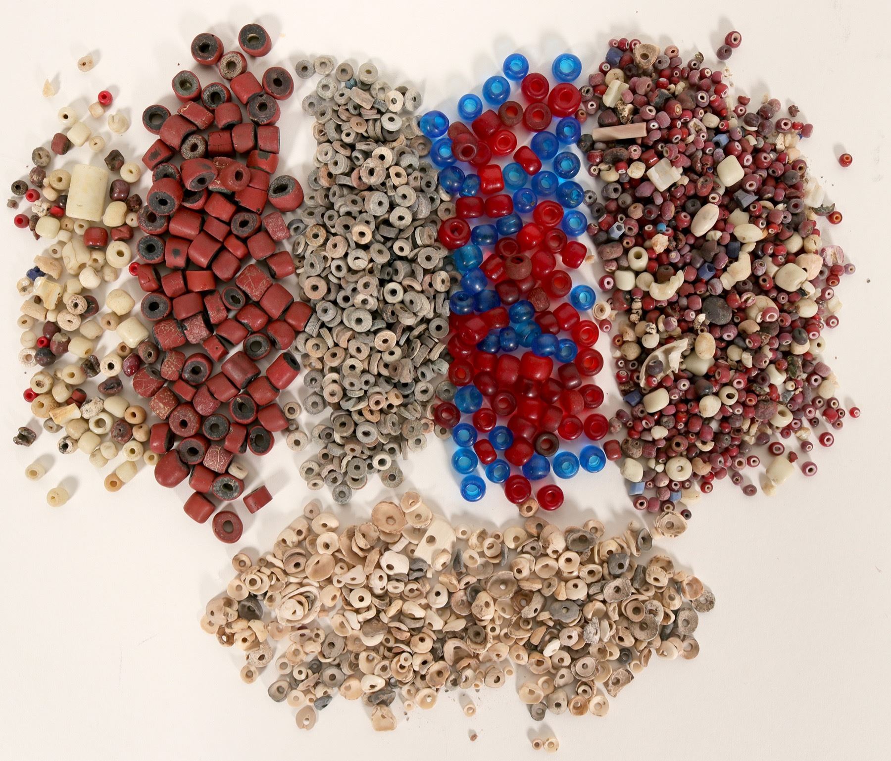 Approx 500 trade beads from tiny to .25". Gray, red, blue, white etc