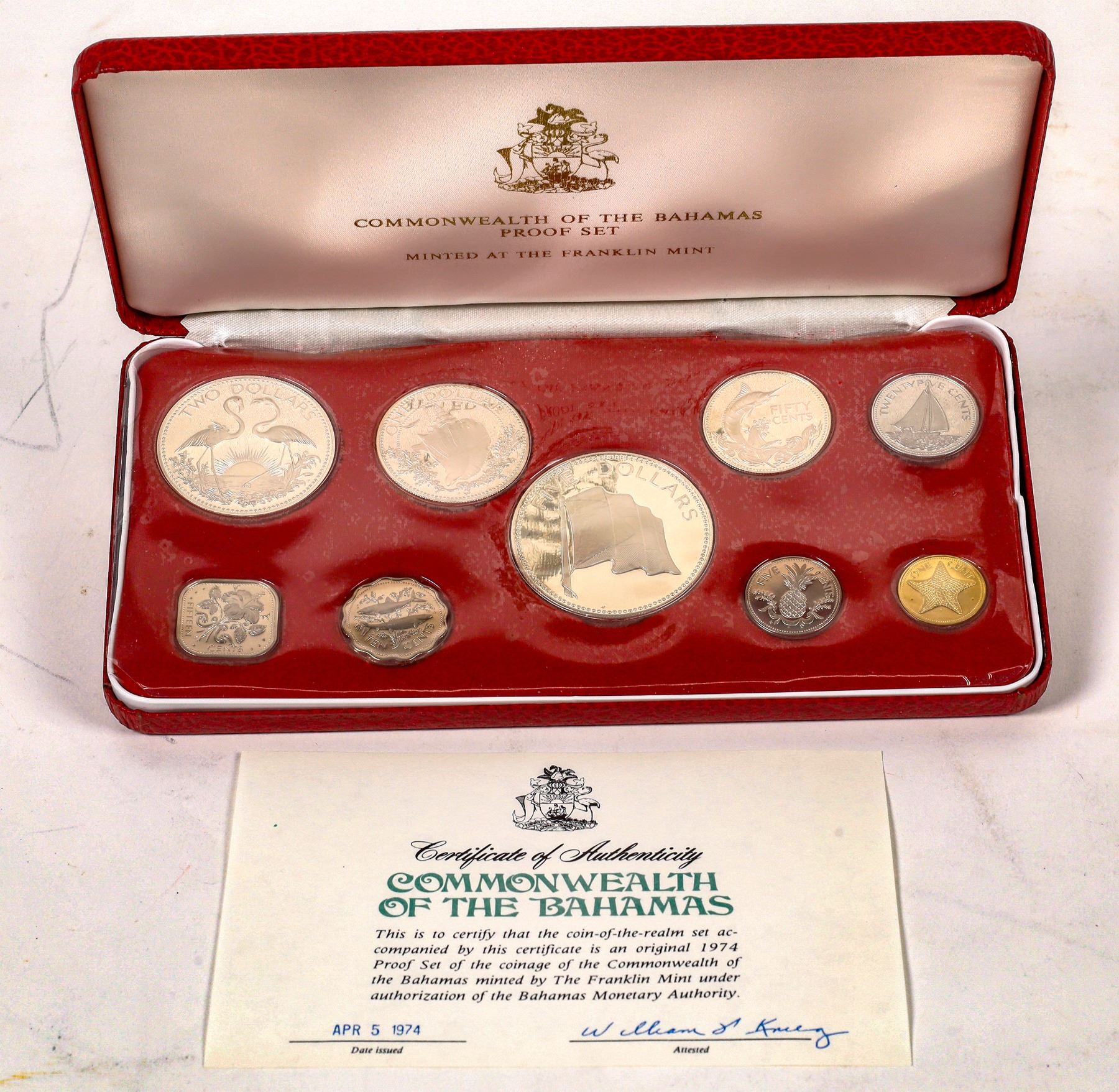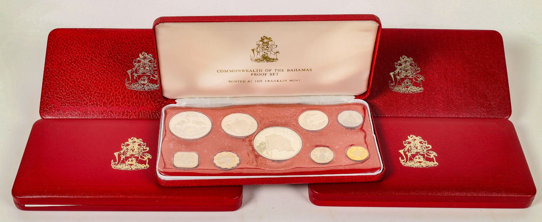Five Commonwealth of the Bahamas Proof Sets minted at the Franklin Mint: 1972 (nine coin set; 2.87 oz. silver; two 1973 (nine coin set, 2.872 oz. silver); 1974; 1976.