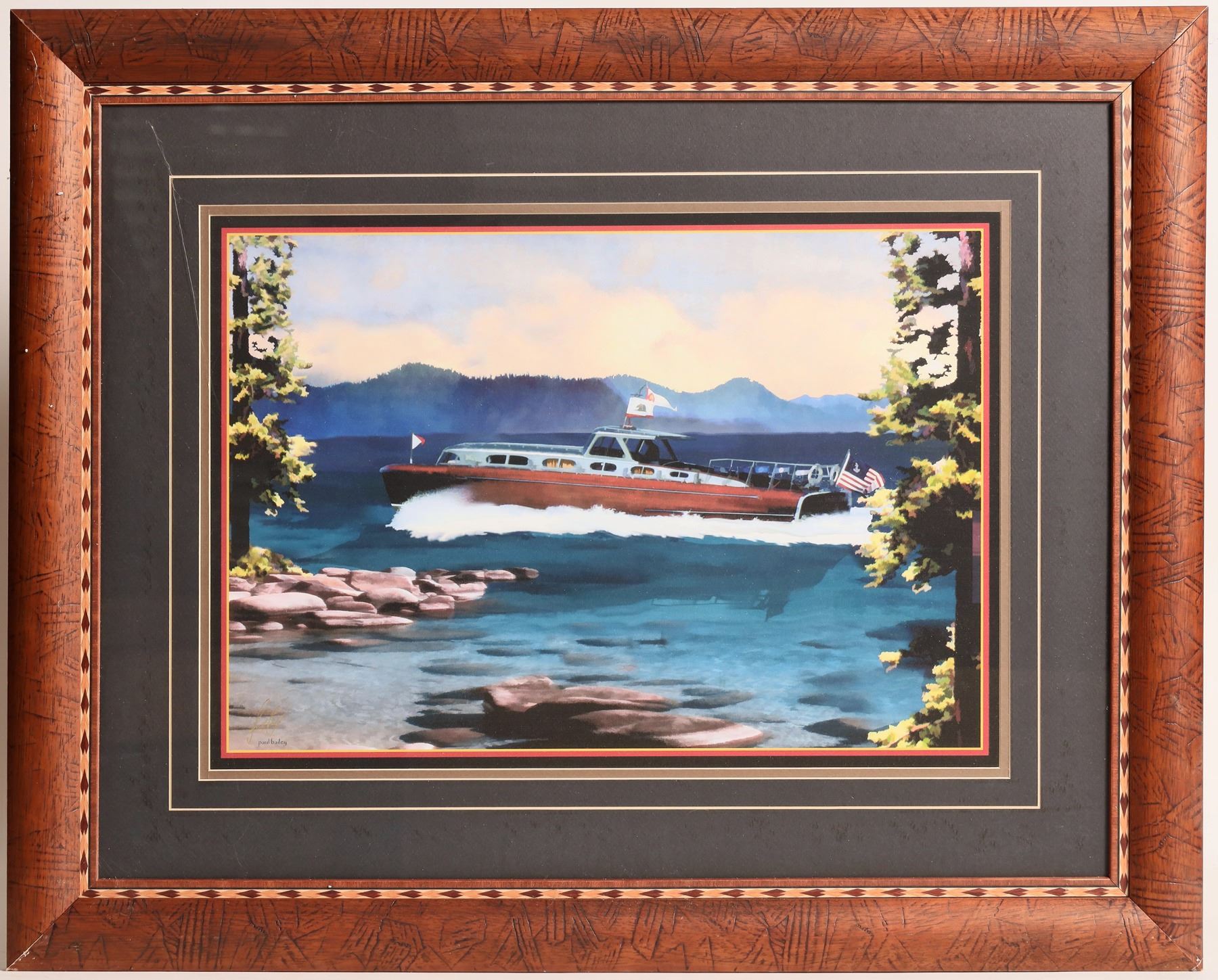 Painting by Paul Bailey of Cabin Cruiser on lake Framed, approx. 24" x 30".