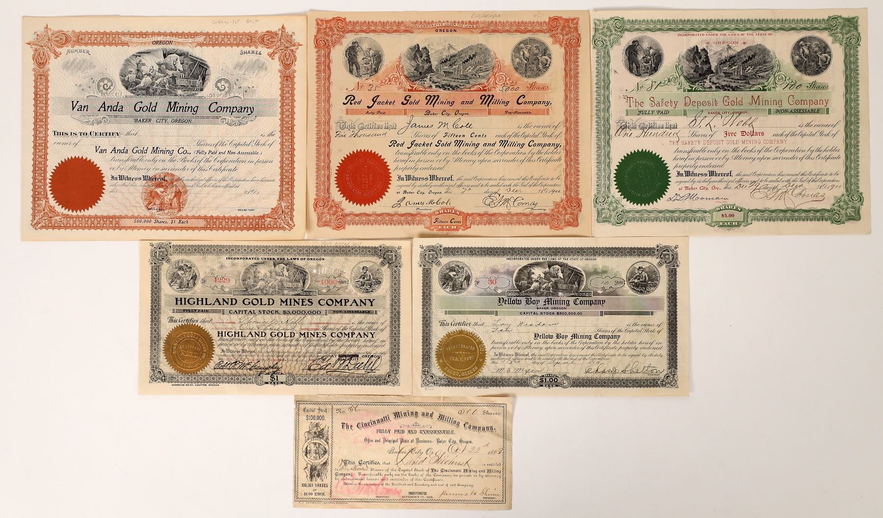 6 Baker City mining stocks ."Prospectors discovered gold in eastern Oregon in 1861 and quickly sparked a rush of miners that led to the creation of Baker City. Soon a saloon, hotel, and blacksmith shop opened, followed by a quartz mill in 1864. The next year the town was laid out and in 1868 it succeeded Auburn as the county seat of Baker County. Baker City officially incorporated as a city in 1874." from westernmininghistory.com. Highland Gold Mines, Van Anda Gold, Safety Deposit Gold, Cincinnati Mining, Jacket Gold, Yellow Boy. c. 1883-1900. Oregon Baker City