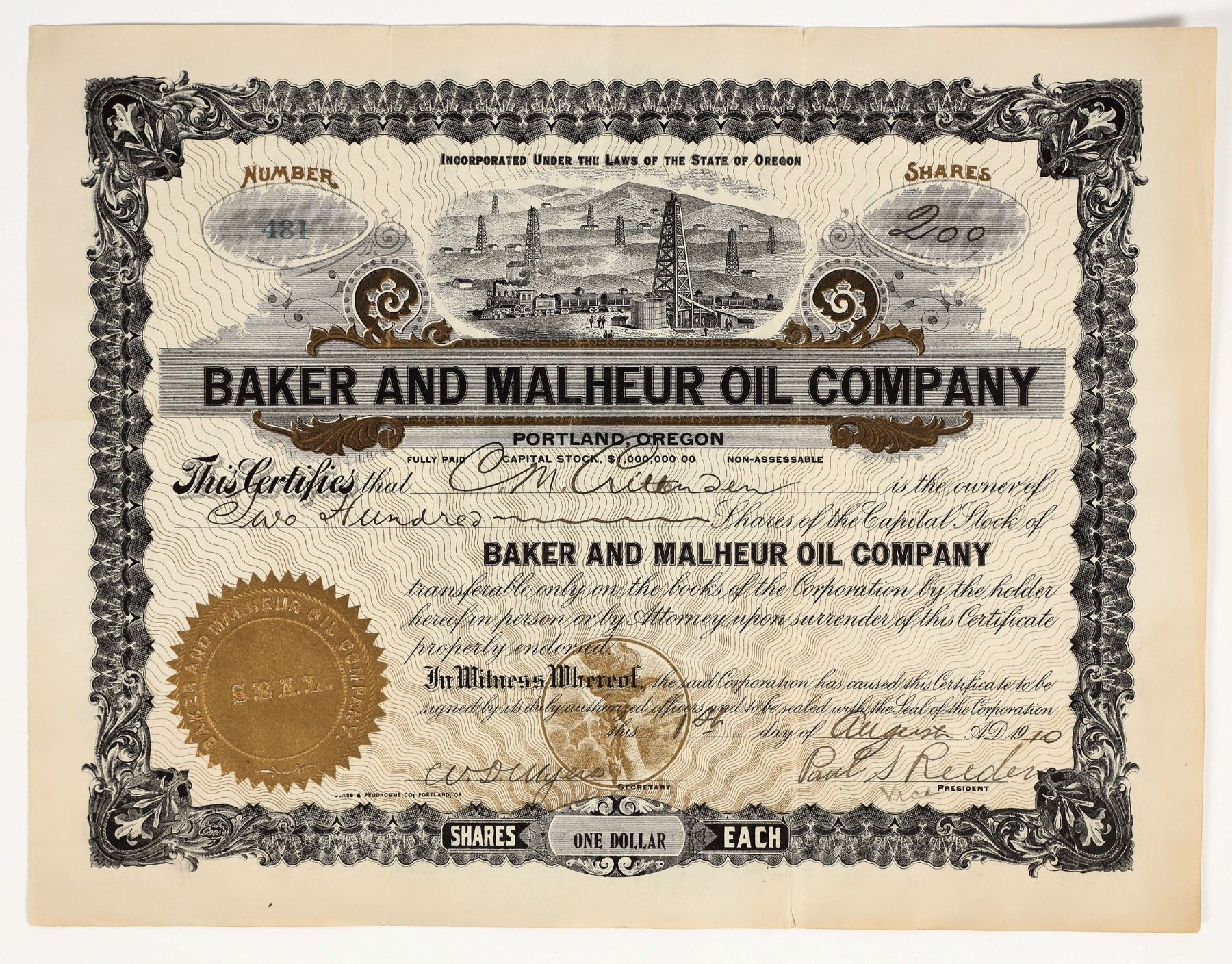 Rare Oregon oil stock; only one present in this Oregon collection. Inc. in Oregon. No. 481, issued for 200 shares to CM Crittenden in 1910. Signed by vice president Reeder and secretary Myers. Black border and print, gilt highlights, and oil field vignette. Deep folds with some separation. Malheur County, Oregon. 4,240 acres.