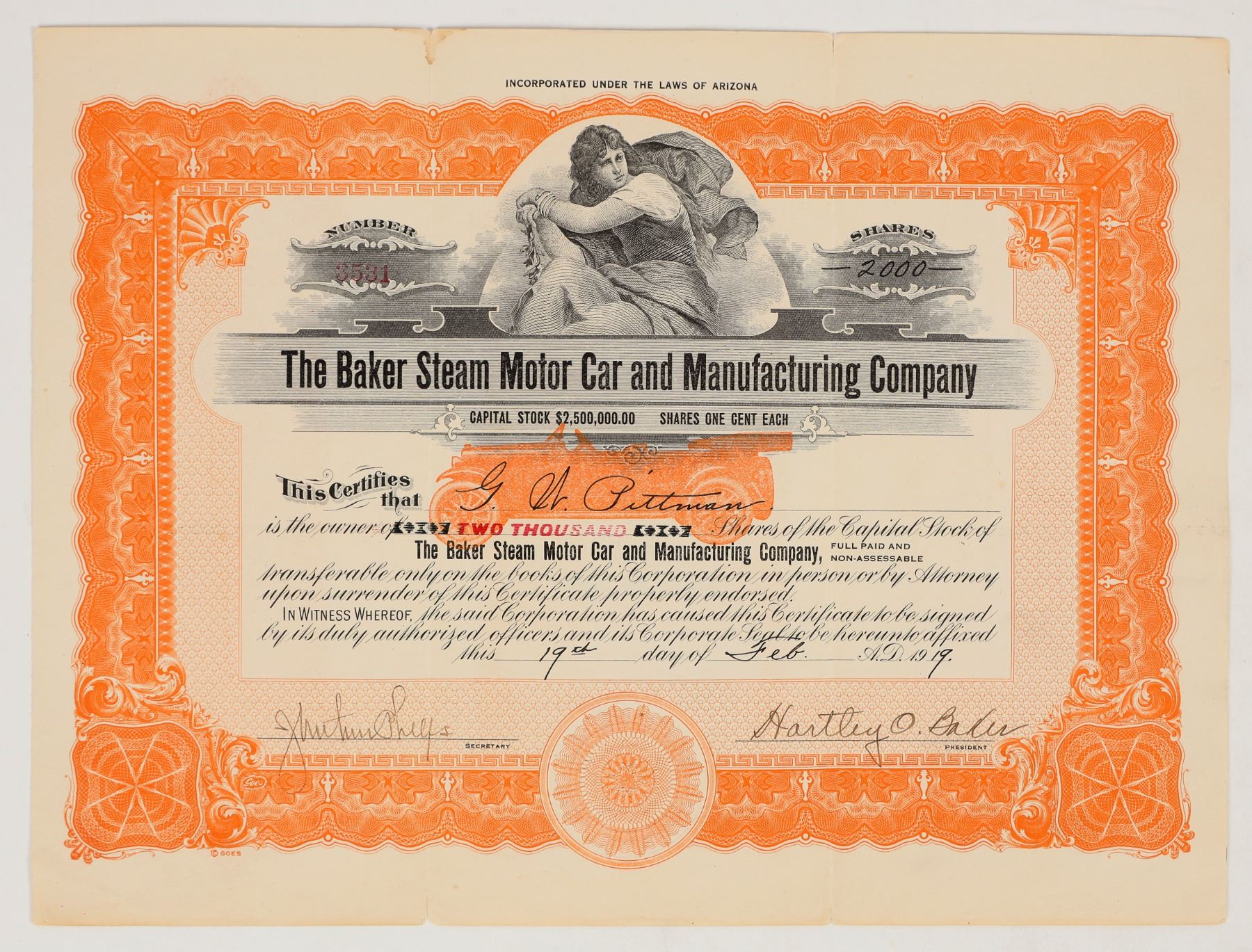 Inc. in Arizona. No. 3531, issued for 2000 shares to Pittman in 1919. The Baker Steam Motor Car & Manufacturing Company operated from 1917 to 1924. It produced steam cars designed by Dr Hartley O Baker, who has hand signed this document as president. The company operated out of Pueblo and Denver, Colorado. Nice orange underprint of a four door convertible touring car. Heavy folds with some separation, some discoloration.