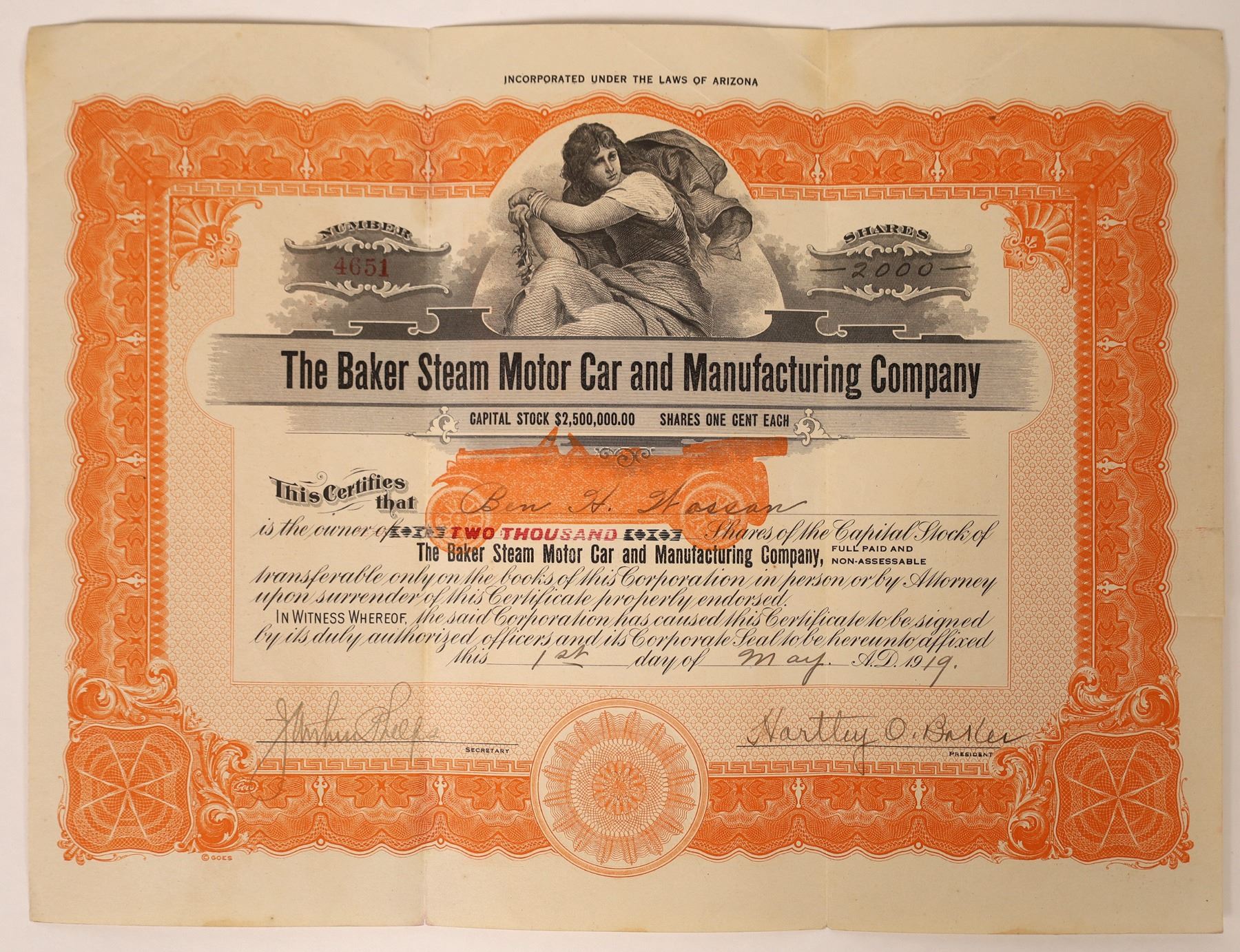 The Baker Steam Motor Car & Manufacturing Company operated from 1917 to 1924. It produced steam cars designed by Dr Hartley O Baker, who has handsigned this document as president. The company operated out of Pueblo and Denver, Colorado. Nice orange underprint of a four door convertible touring car.