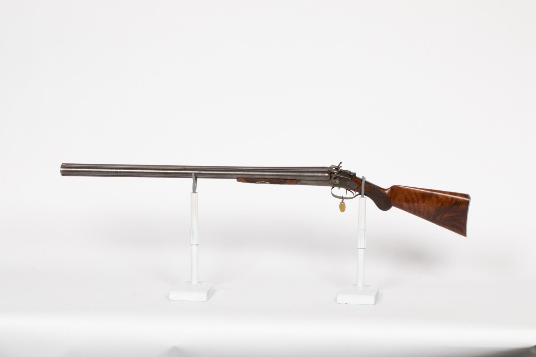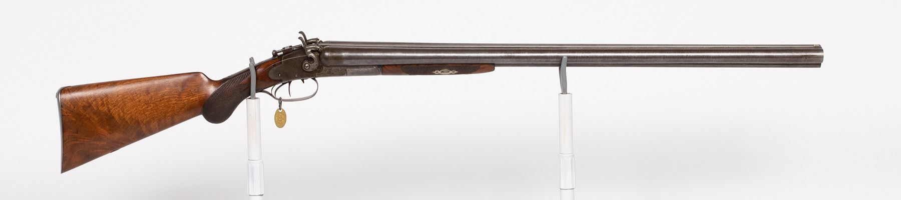 Baker Maker of the LC Smith an early version of the LC Smith shotgun. Lyman Smith and Mr. Baker eventually separated and started their own company. The LC Smith Shotgun co and the Baker Batavia NY shotgun company. This is an American Drilling shotgun in 10-gauge black-powder cartridge gun. SN: N/A, JMD Oval Tag: 4665, Condition: Excellent, >
