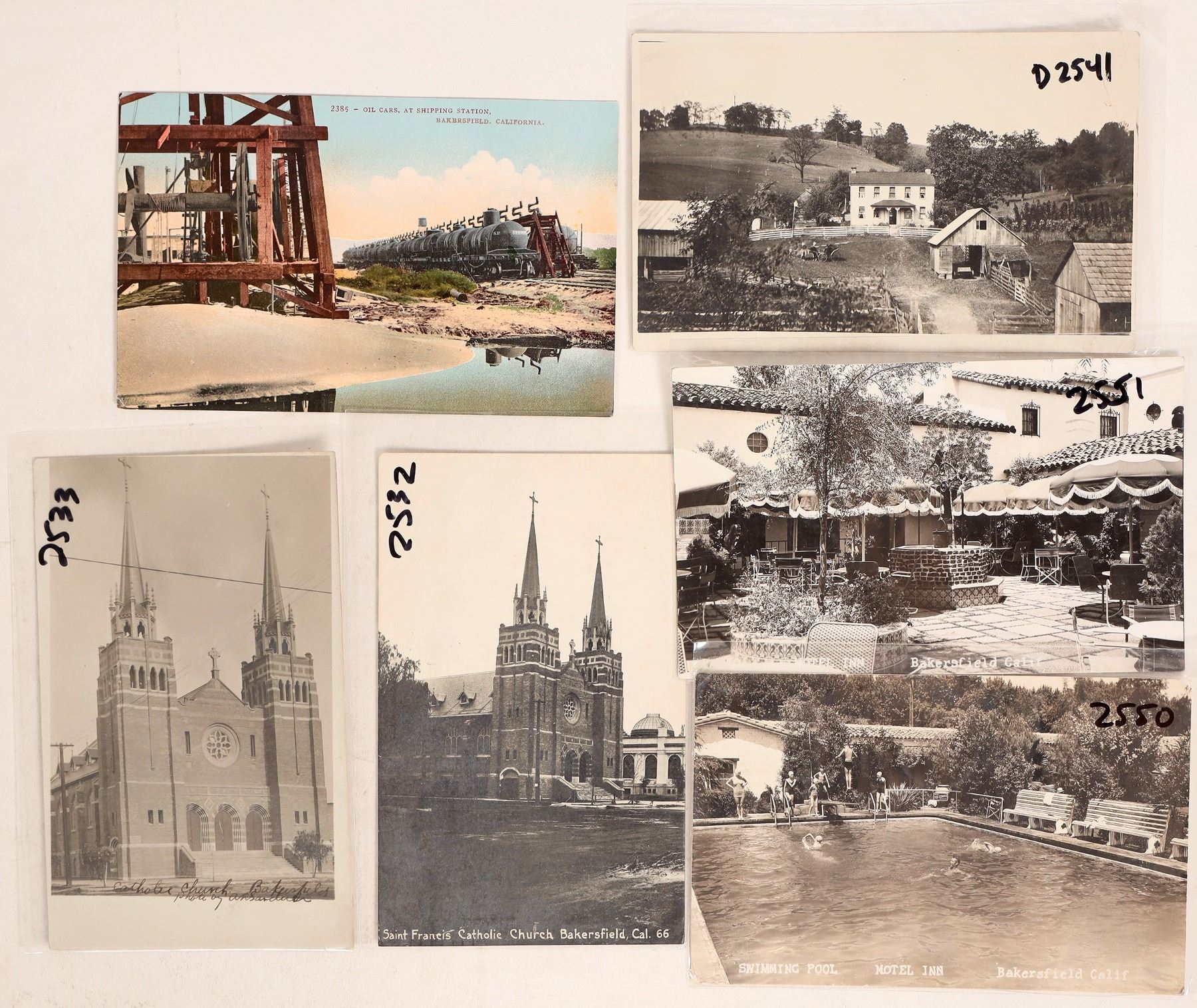 A mini collection of 6 postcards from Bakersfield, Ca., c1910-43. Includes 5 RPCs and 1 chromolitho. Oil well, church, motel and farm. [Bakersfield] [California]