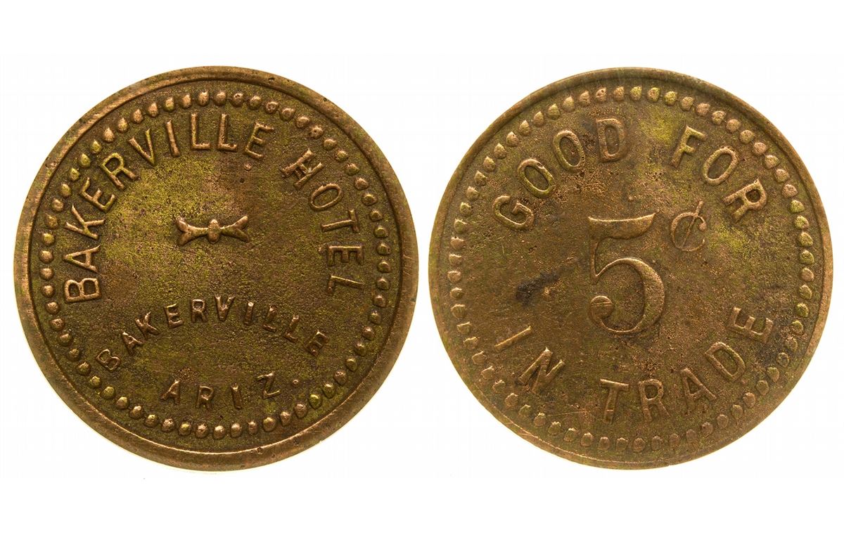 Obv.: Bakerville Hotel / Bakerville/ Ariz.; Rev.: Good for / 5c / In Trade; NCS genuine, R8, one token town.