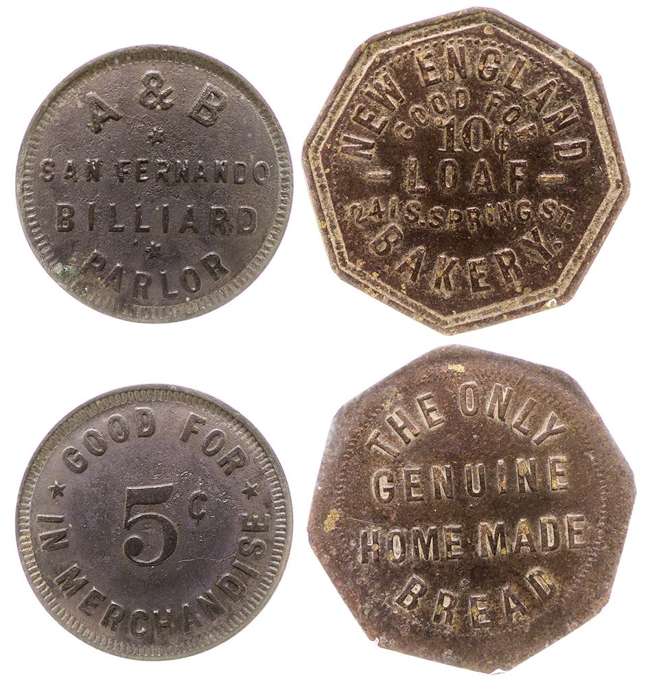 Two pieces. 1] New England / GF / 10c / Loaf / 241 S Spring St / Bakery // The Onnl / Genuine / Home Made / Bread. 2] A & B / San Fernando / Billiard / Parlor // GF / 5c / IM.