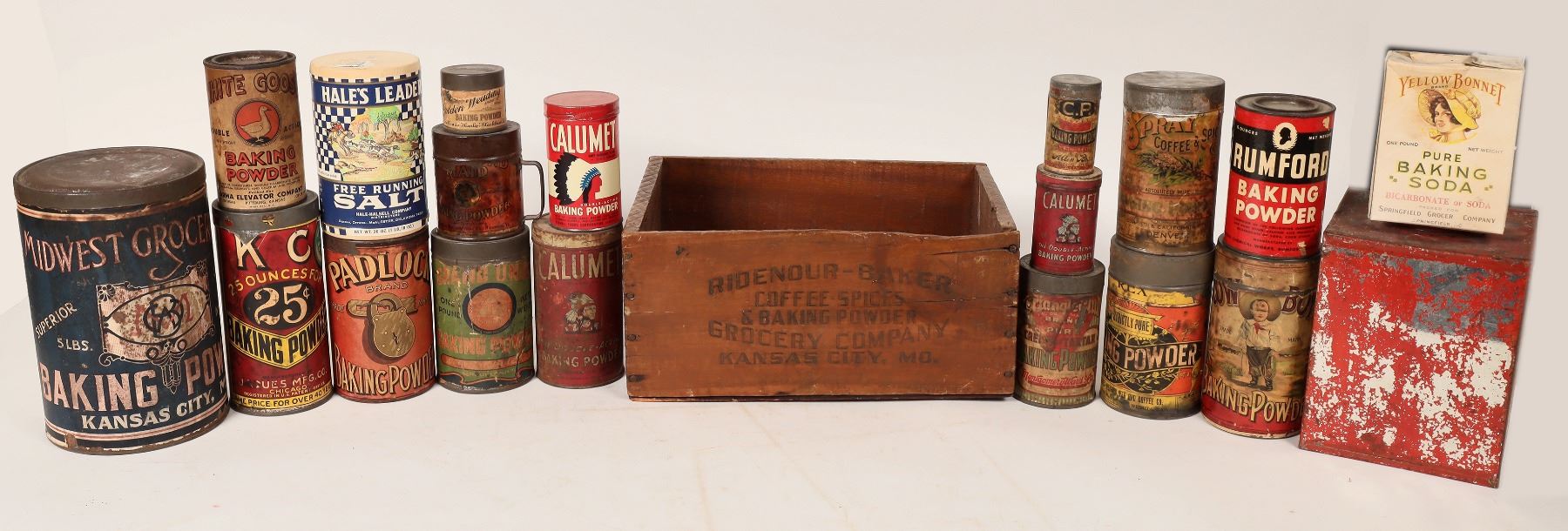 Baking powder and soda assortment includes boxes and cans with Yellow Bonnet, Midwest Grocer, Golden Wedding, KC Baking Powder, Calumet Baking Powder, Rumford Baking Powder, Triangle Club Cream of Tartar Baking Powder and a paper cannister of Hale's Leader Free Running Salt. All are in nice condition. Please see photos for more details.