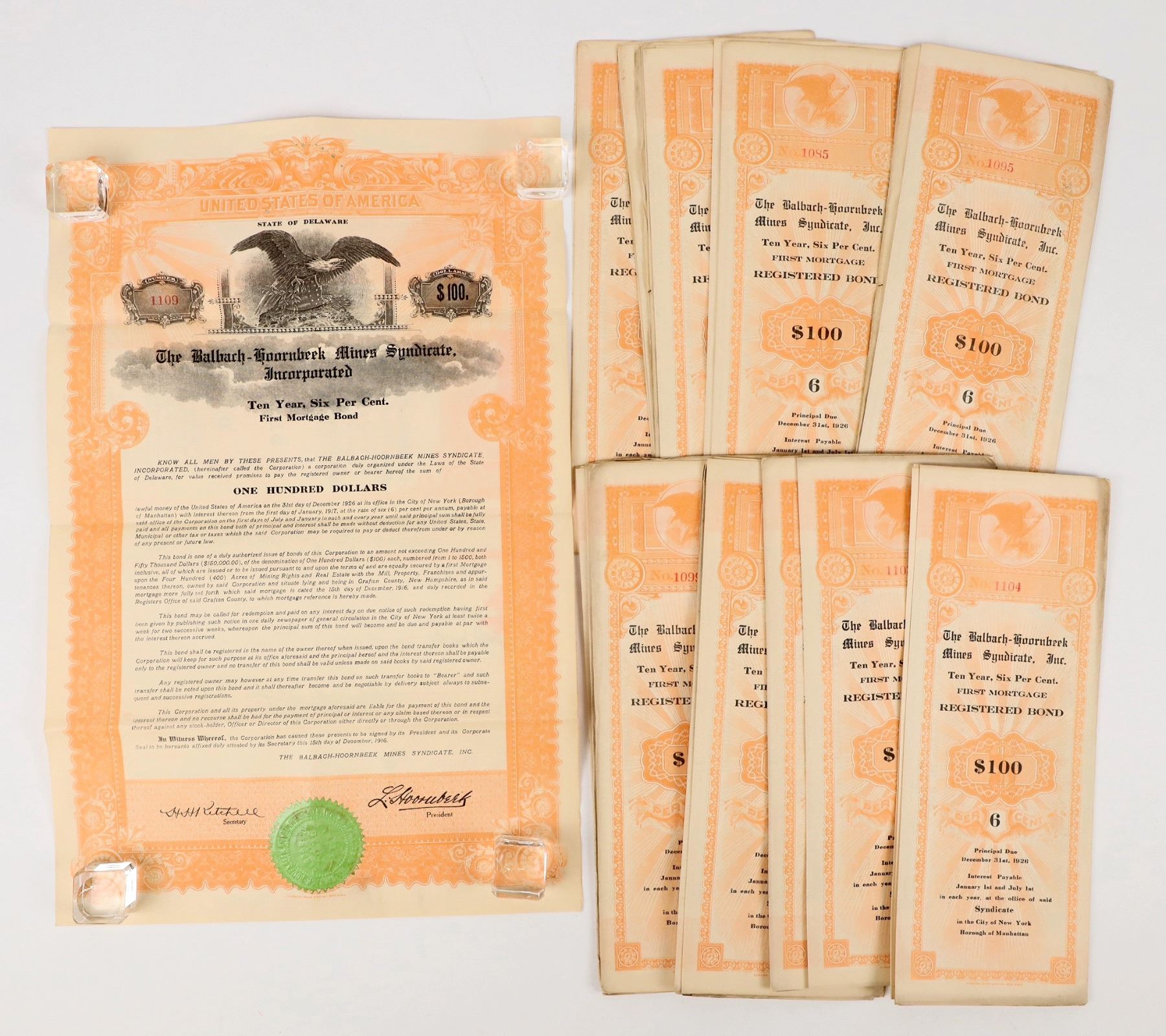 Lot of 18 issued $100 bonds, 1916. Text on bond states property is in Grafton County, New Hampshire. We were not able to locate additional information.