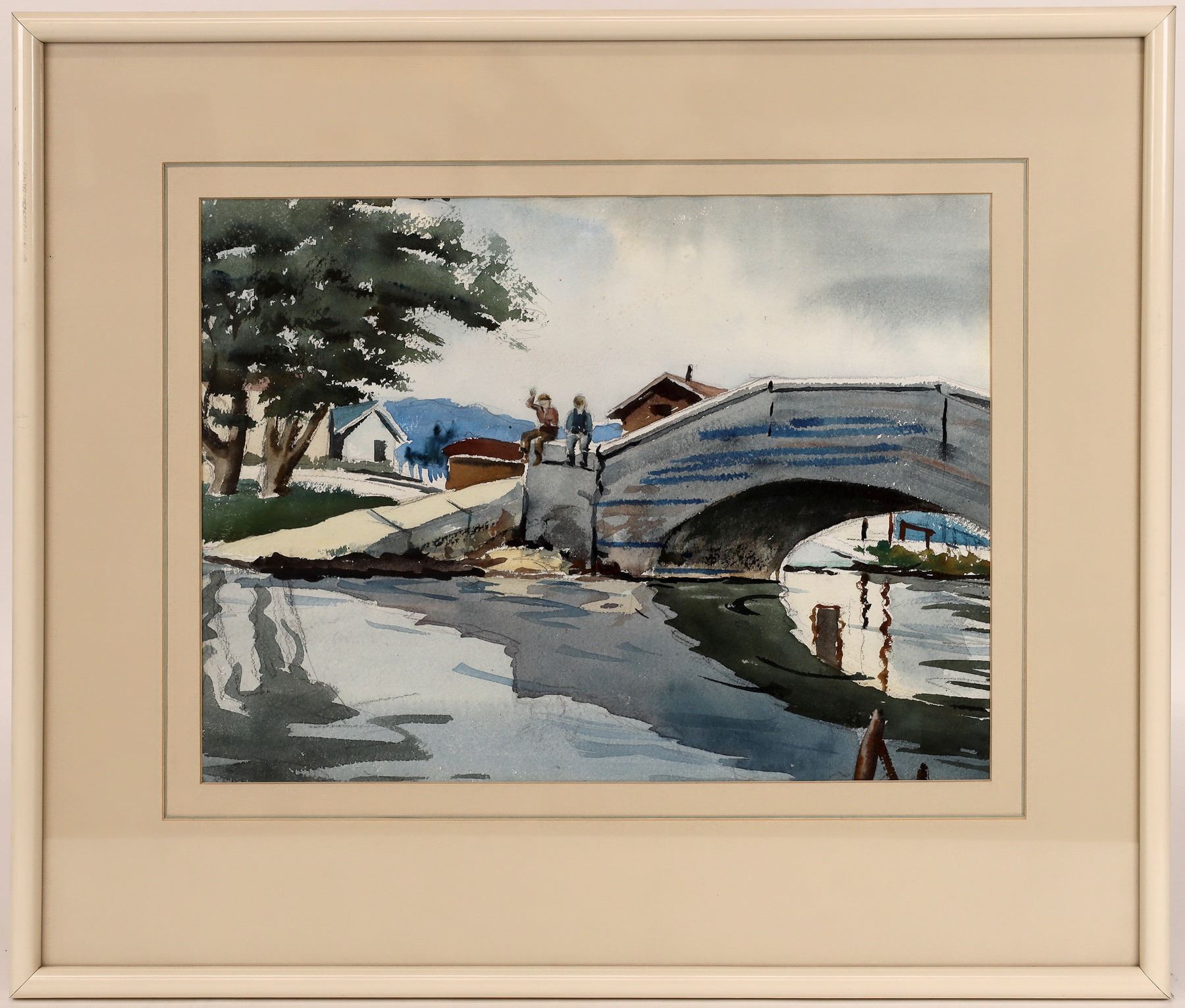 Watercolor by Mondras measures about 21 x 24" overall size of old bridge at Balboa Island in southern California. California