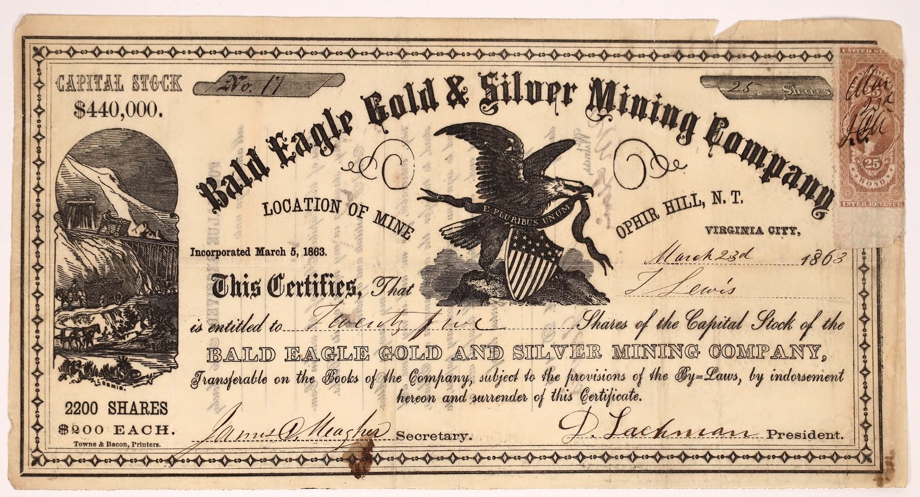 Bald Eagle Gold & Silver Mining Company - Ophir Hill, Virginia City, N.T. - Stock Certificate No. 17 for 25 shares made out to L. Lewis dated March 23rd, 1863. The Company was capitalized at $440,000; 2200 shares at $200 each. Signed by D. Lachman, President, and James D. Meagher, Secretary. Signed red-brown, twenty-five cent, Bond Revenue stamp on right upper corner. Two vignettes: on left mining tunnel and cars loading ore and center top allegorical eagle. Printed by Town & Bacon.