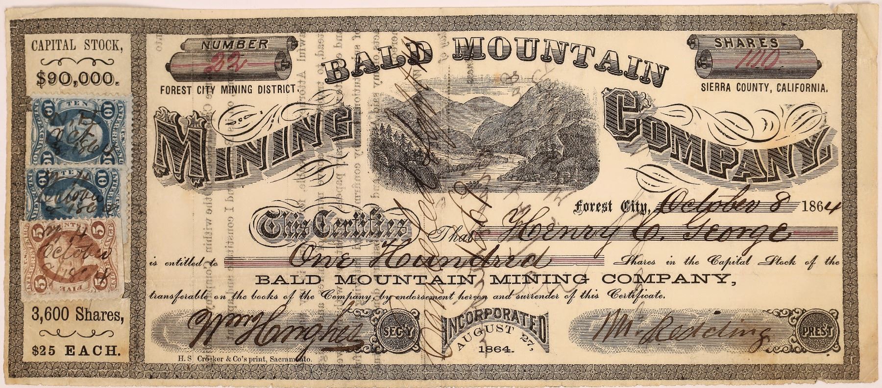 Really rare. # 22 for 100 shares to Henry George. Signed by Secretary William Hughes and president Redding. Valley vignette. Two blue 10c stamps and one 5c light brown stamp used in place of revenue stamp. H. S. Crocker of Sacramento print. First settled in 1852, the camp was originally known as Brownsville, then Elizaville, and finally Forest City when the post office was established in 1854. Forest City was an important mining camp and trade center during the 1850s. A latter iteration of the Bald Mountain was Forest City's most famous mine, producing some $3.1 million in gold. State:California City:Forest City, Sierra County Date:1864 Provenance: