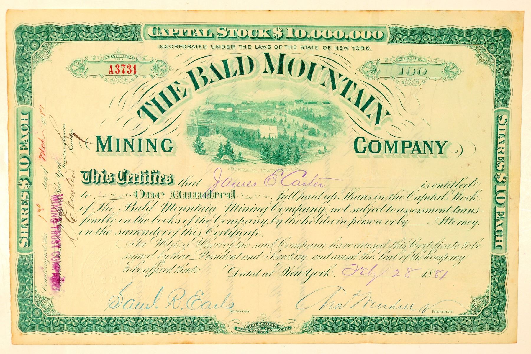 Inc. in New York. No. A3734, issued for 100 shares to James E. Carter on Feb. 28, 1881. Signed by vice-president Wendell and secretary Earls. Not cancelled. Green border and print, with birds-eye vignette of Fryer Hill. Pinholes, folds, other light wear. 7.25 x 11" Printed by Franklin Bank Note Co. Bald Mountain is 3 miles from Leadville in the California District. By 1883, the Bald Mountain Mine had become part of the Green Mountain Consolidated Mining Co. whose claims included the Bald Mountain, Grenadier, Mary C, Golden Casket, Colorado Princess, Humboldt, E.C.B., J.Q.S., and Black Diamond. 50 acres total. [Ref:1883 CO Mining Directory] () Ken Prag Collection