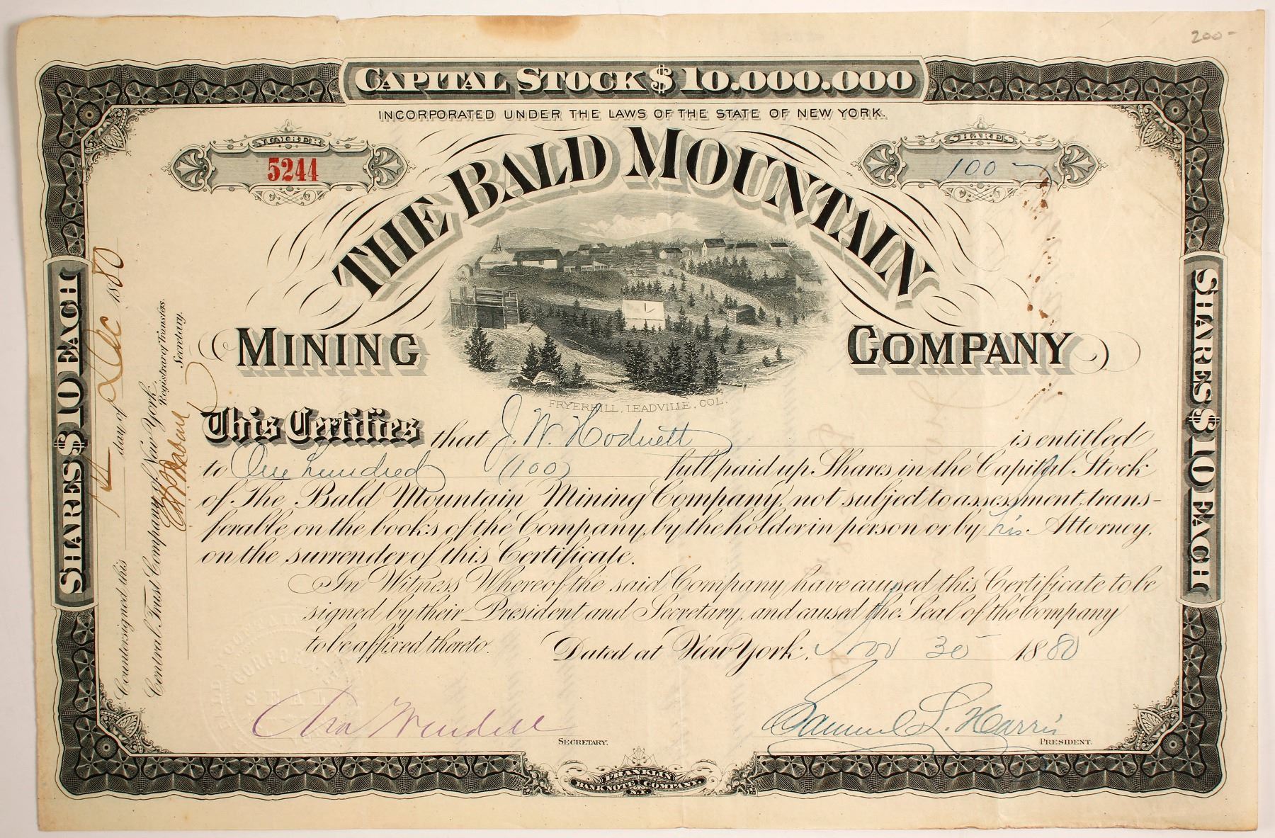 I/U #5244 100 shares JN Hoduett 1880. Signed by President Harris. Wrinkles, top toning, pin holes.