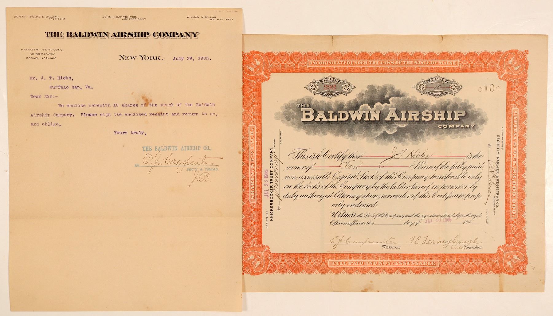 Lot of 2. Inc. in Maine. 1) Stock No. 292, issued to JT Hicks for 10 shares in 1905. Signed by vice-president FC Ferneyhough and treasurer EJ Carpenter. Not cancelled. Orange border, black print, fancy logo with company name in the clouds. Printed by the Broun-Green Co., NY. Heavy folds with some separation, toning, soiling. 9.5 x 11.5" 2) Letterhead from treasurer Carpenter that accompanied the stock to Hicks. Folds, toning. Captain Thomas S. Baldwin is listed as company president. Baldwin got his start in the air by performing circus acts on hot air balloons. Between 1900 and 1908, he built a number of non-rigid airships. Among the most famous was the California Arrow, powered by a small Curtiss engine and piloted by Roy Knabenshue at the 1904 St. Louis World's Fair. In 1905, the Baldwin Airship Company was incorporated, and Captain Baldwin soon became a major name in the early American aviation circles. In 1907, the Baldwin company was commissioned by the U.S. Army Signal Corps to build an airship. The 29 m (96 ft) long non-rigid was powered by a 20-horsepower Curtiss engine, traveled at a speed of 20 mph, and had a total lifting capability of 1,360 lb. It was tested successfully for the Army in August 1908 and was designated the SC-1. By 1909, Baldwin shifted his focus to heavier-than-air flight. In 1911, he built the Red Devil, one of which is on display at the Smithsonian. [Ref: https://www.si.edu/object/nasm_A19500094000] Ken Prag Collection