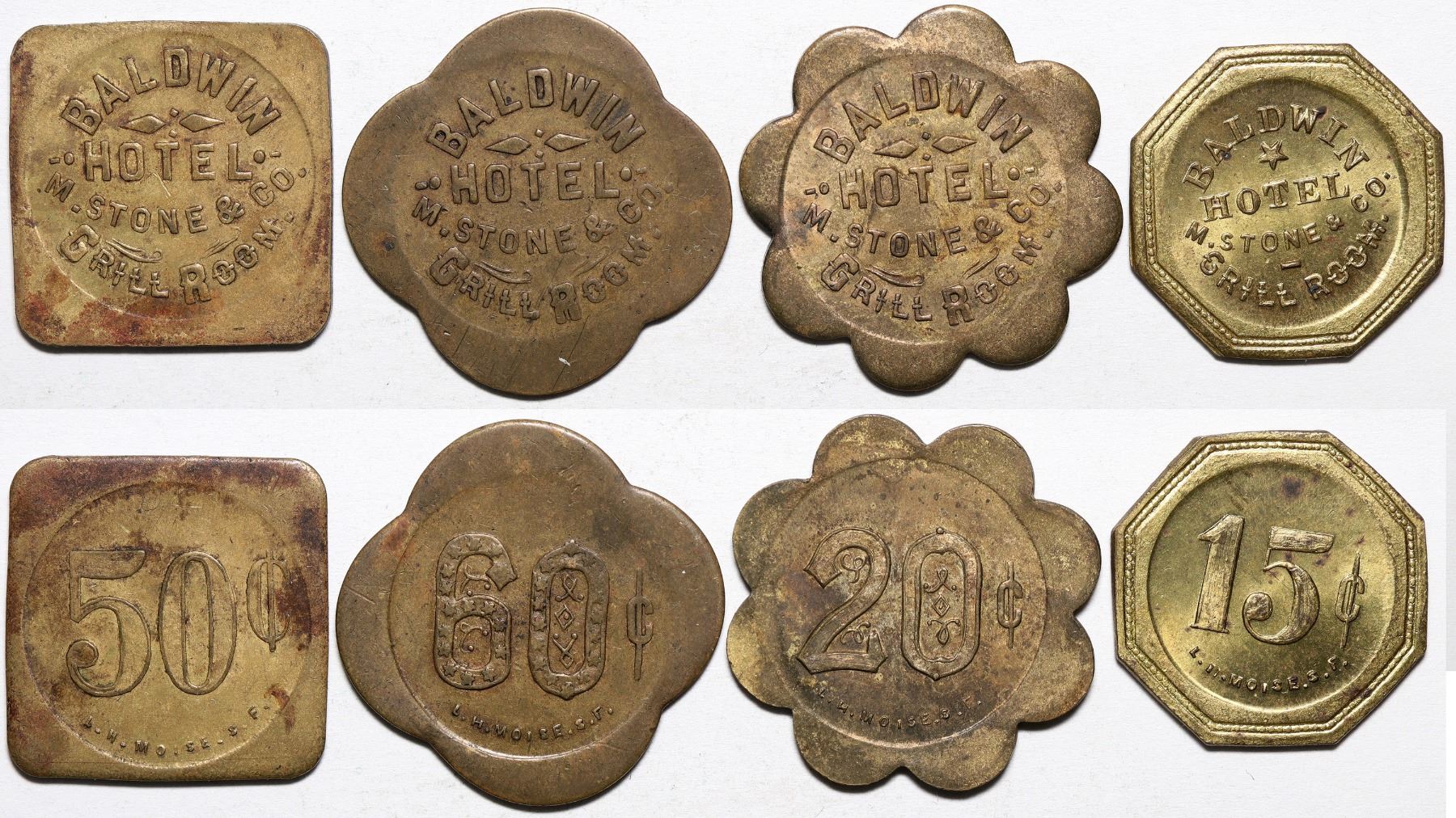 Lot of four different Baldwin Hotel tokens: square, octagonal, 4 scalloped and 8 scalloped. Baldwin Hotel was a 19th-century luxury hotel and theatre built by Comstock Lode millionaire, entrepreneur, and gambler Elias Jackson "Lucky" Baldwin. It was located on Powell Street at the corner of Market Street, near the Union Square area.