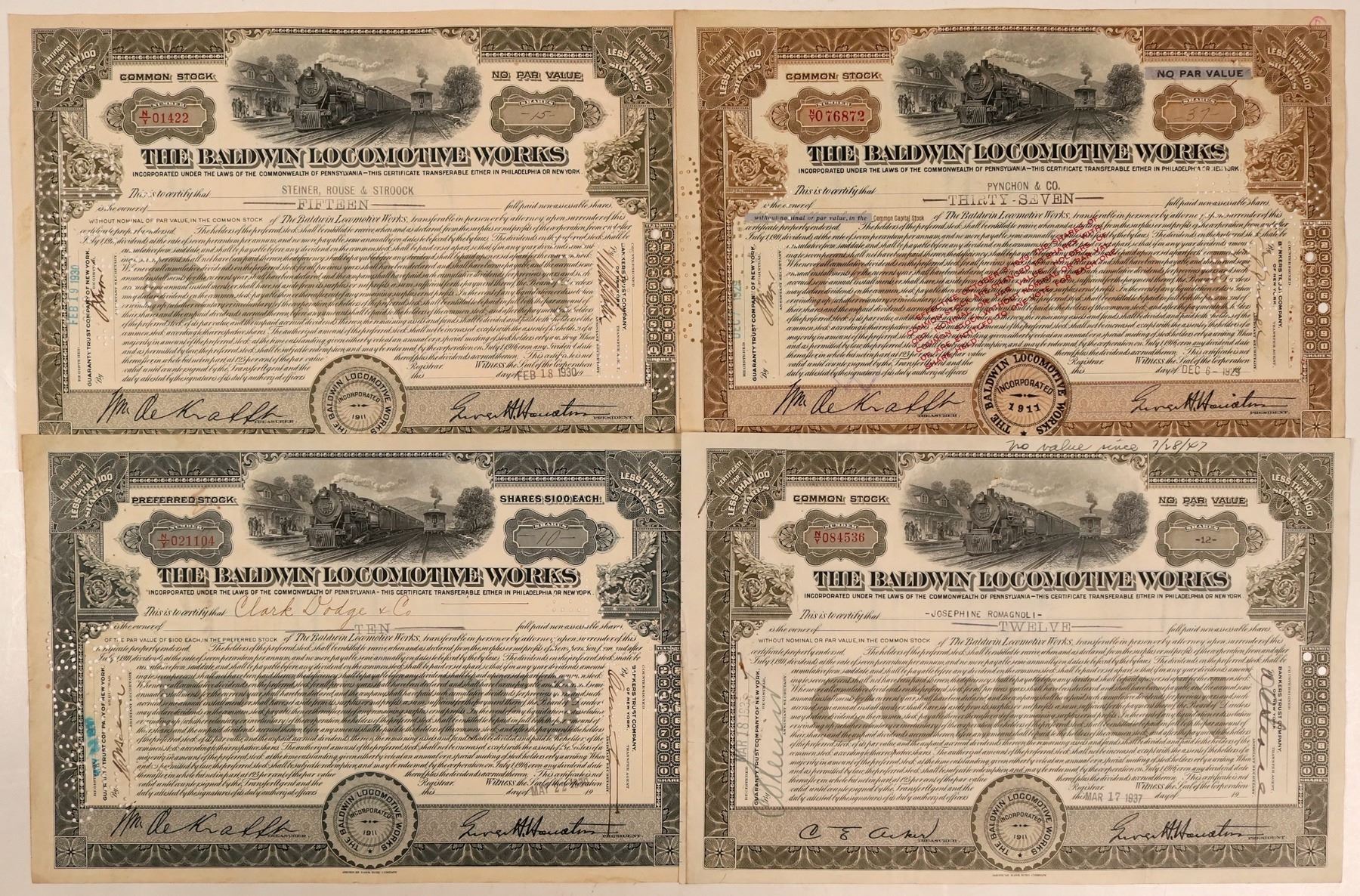 Three common certificates issued between 1929 and 1937, one brown and two green. The 1937 green one is uncancelled, which is rare. Also, a green, preferred certificate issued in 1930, and cancelled. All four have a vignette of two trains passing the train station. ABN.
