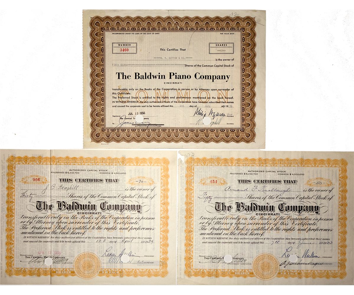 Common stock certificates from The Baldwin Company (2) and Baldwin Piano Company, Cincinatti. The three were issued in 1933, 1939 and 1956. Tiny chip missing at top left corner of the 1933 stock and a 1" tear in the top margin of the 1956 certificate. All have large circle hole cxls thru signatures.