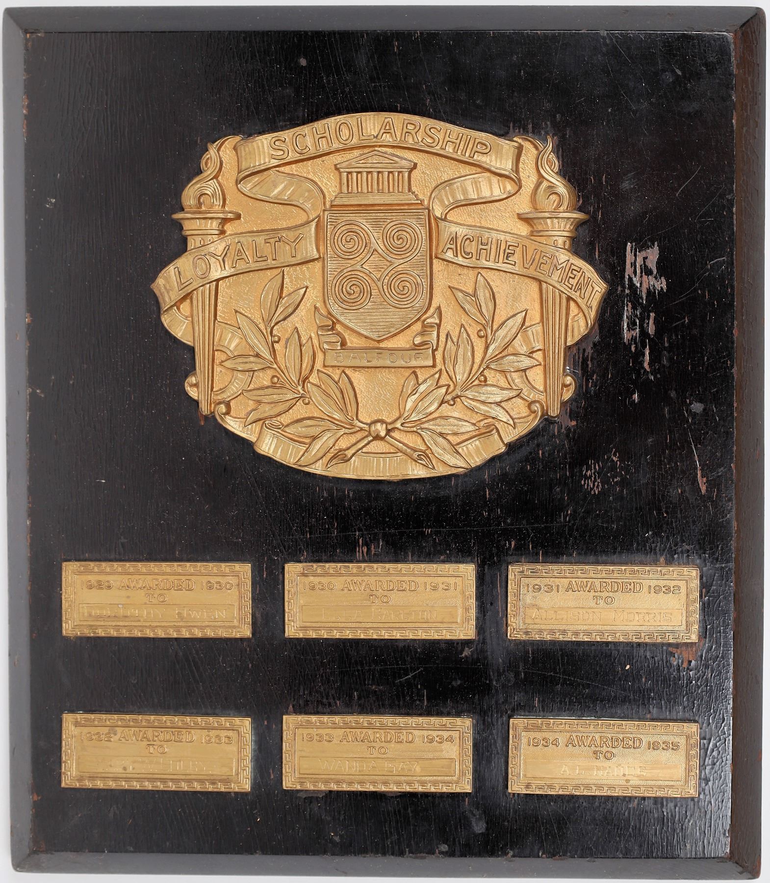 School award plaque from Balfour. This plaque has six different plates with the name of the annual winner on each. It is unclear what this award was for, but it was awarded annually between 1929 and 1935. Brass plates on wooden plaque, 10 x 12 inches. Good condition, some scratches on the wood.